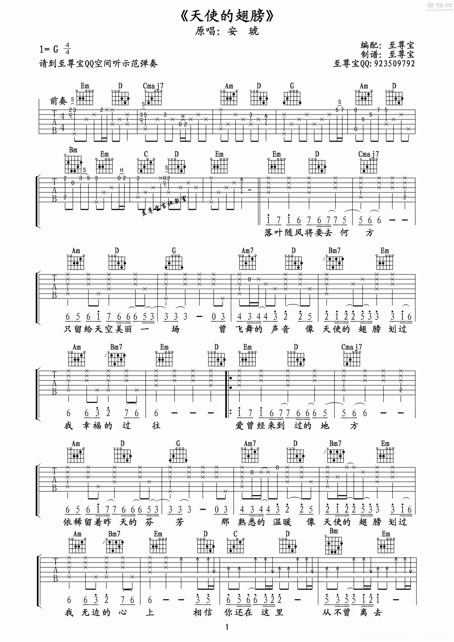 天使的翅膀吉他谱 - 安琥 - G调吉他弹唱谱 - 扫弦简单版