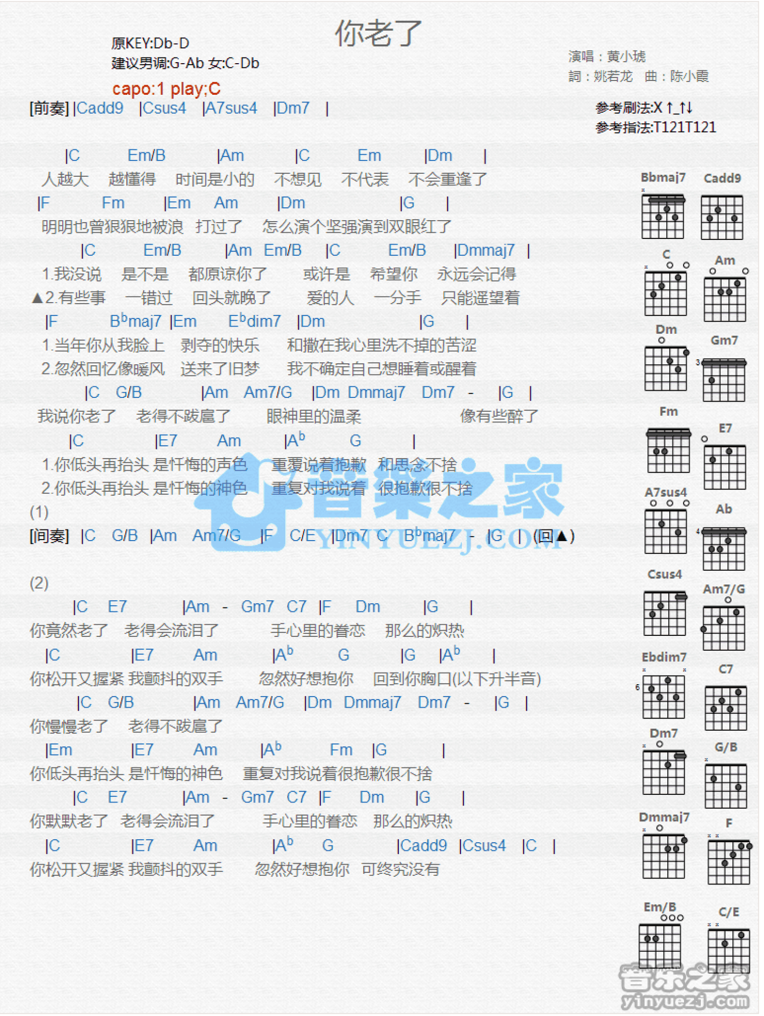 曲谱介绍: C调版黄小琥《你老了》吉他和弦弹唱谱