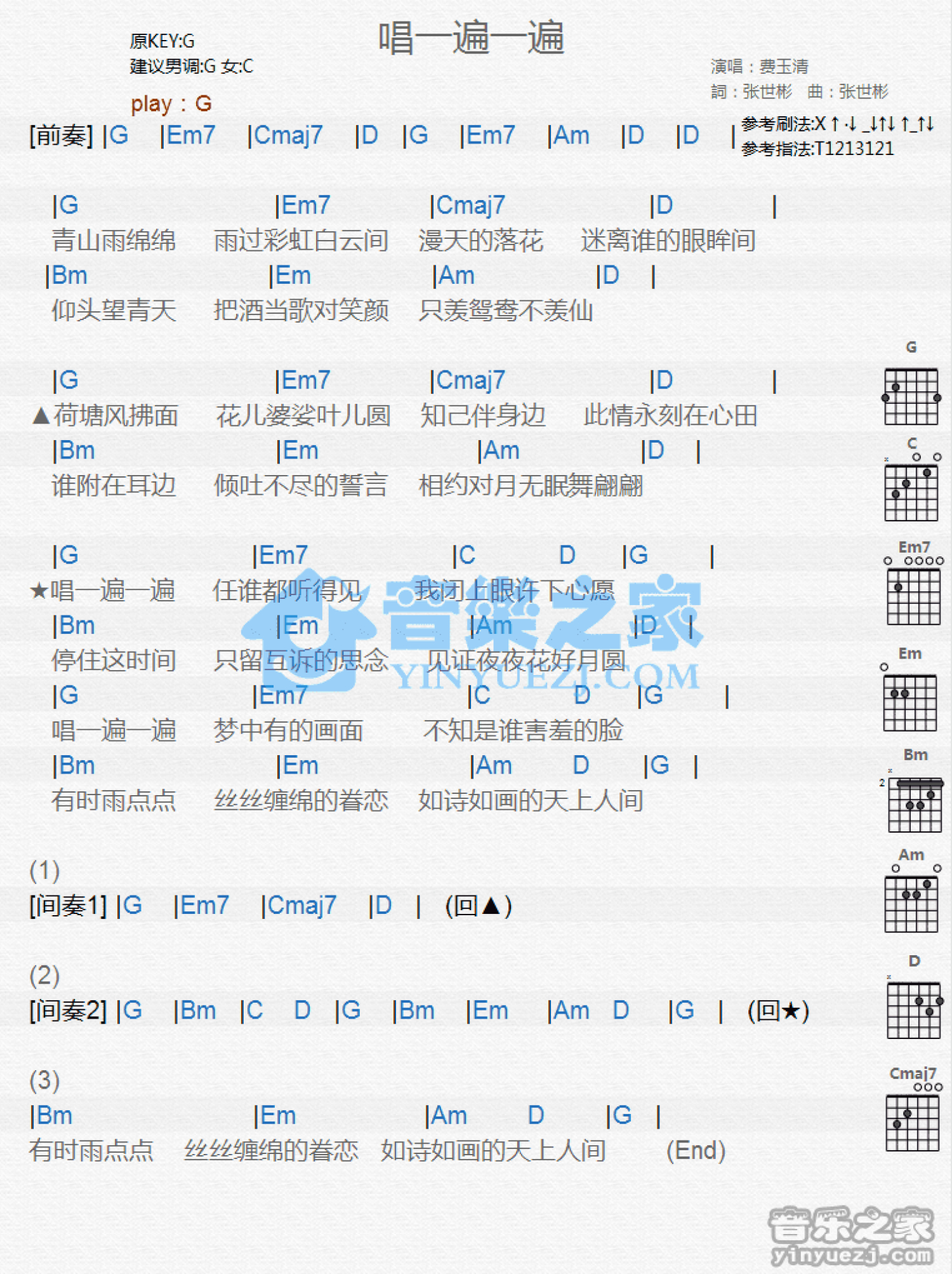 曲谱介绍: G调版费玉清《唱一遍一遍》吉他和弦弹唱谱
