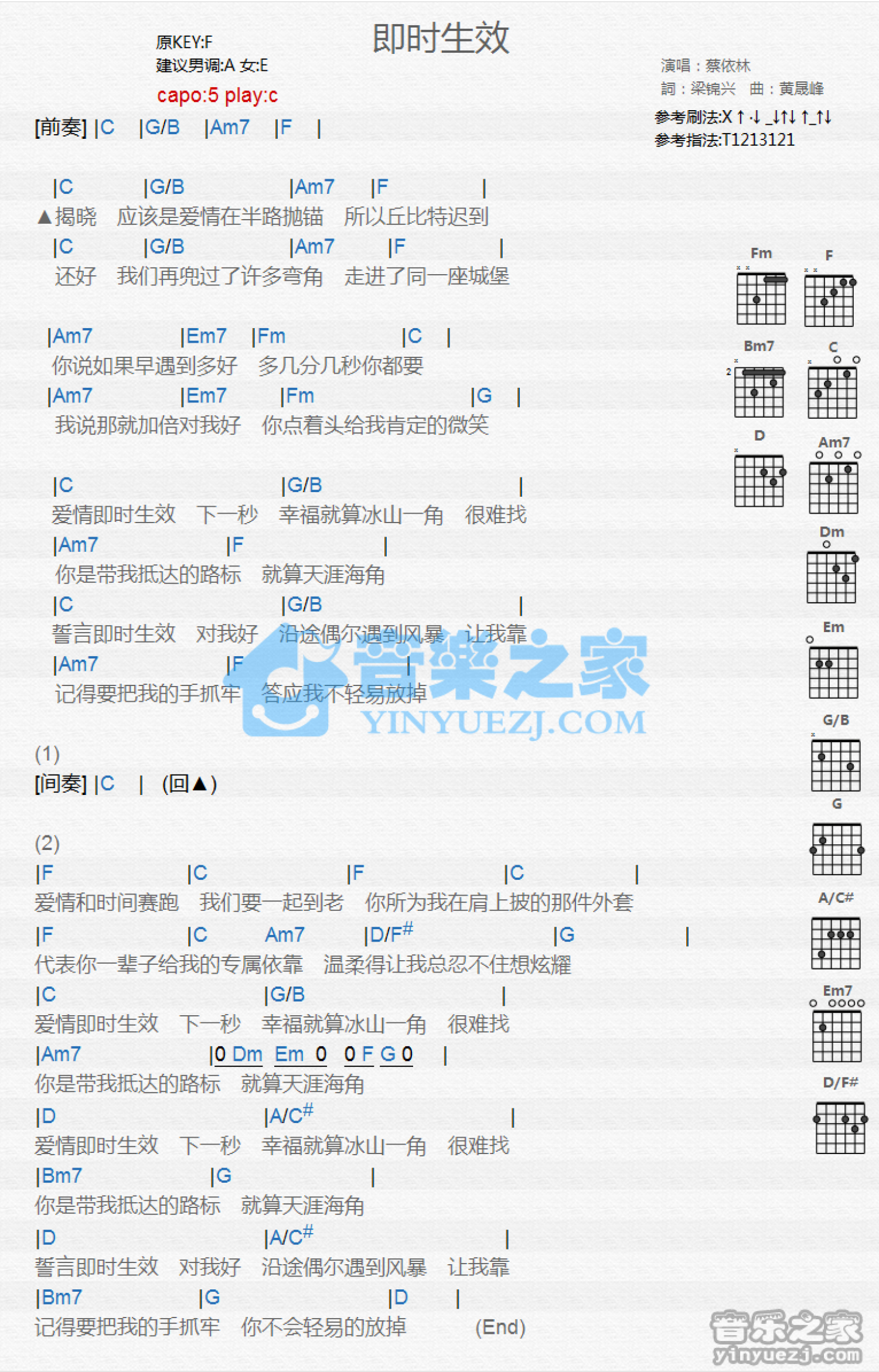 曲谱介绍: C调版 蔡依林《即时生效》吉他和弦弹唱谱