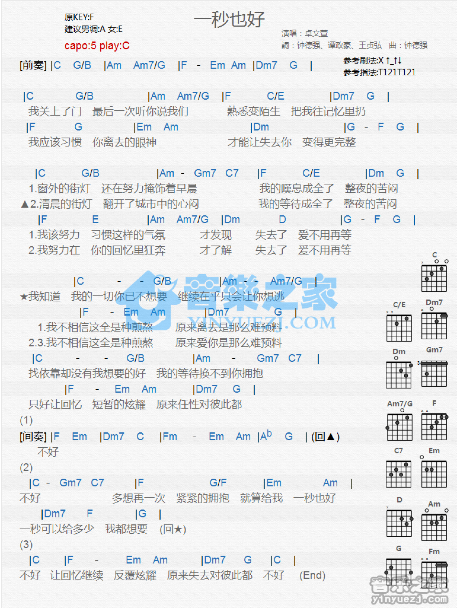 曲谱介绍: C调版卓文萱《一秒也好》吉他和弦弹唱谱