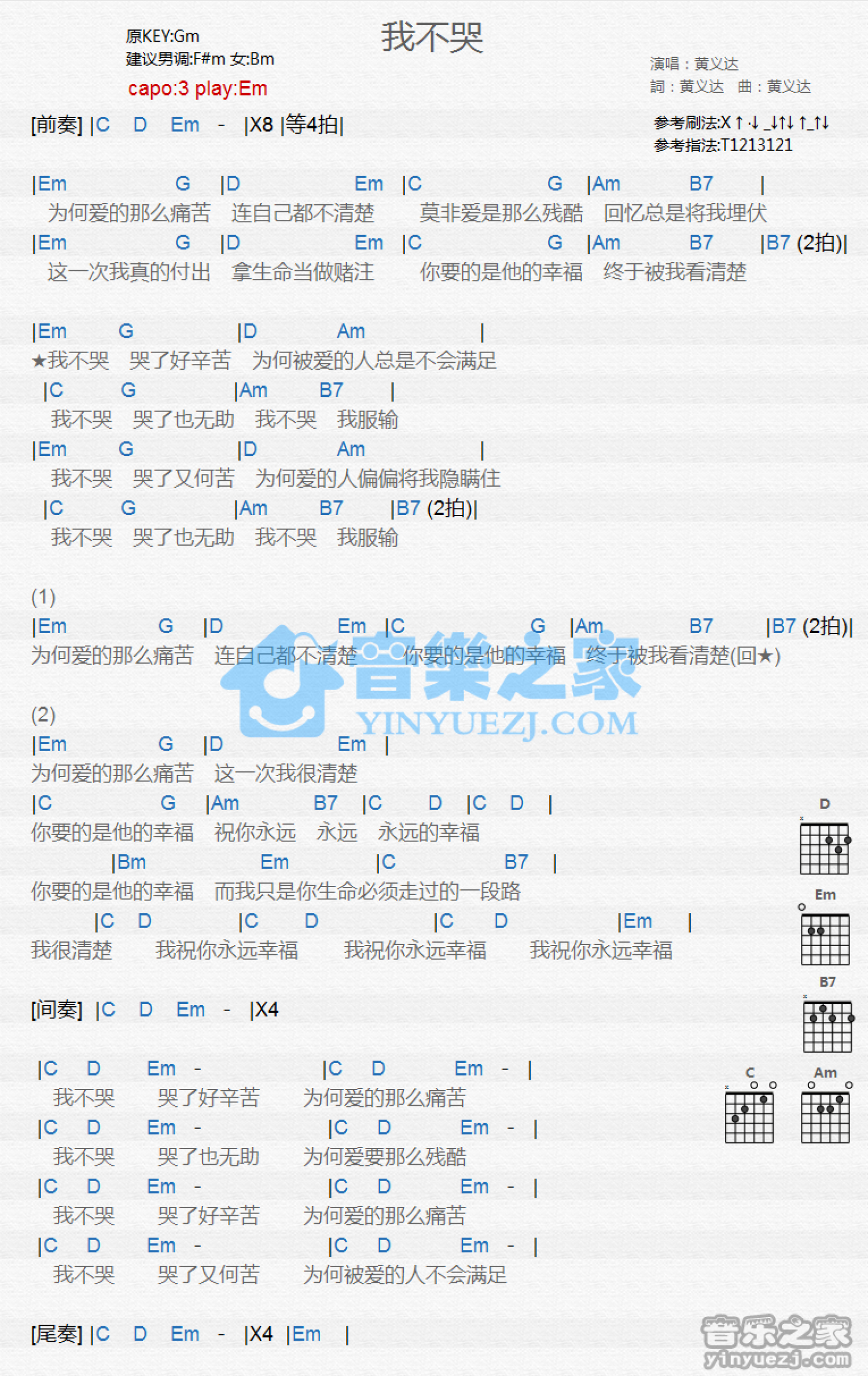 曲谱介绍: Em调版《我不哭》吉他和弦弹唱谱