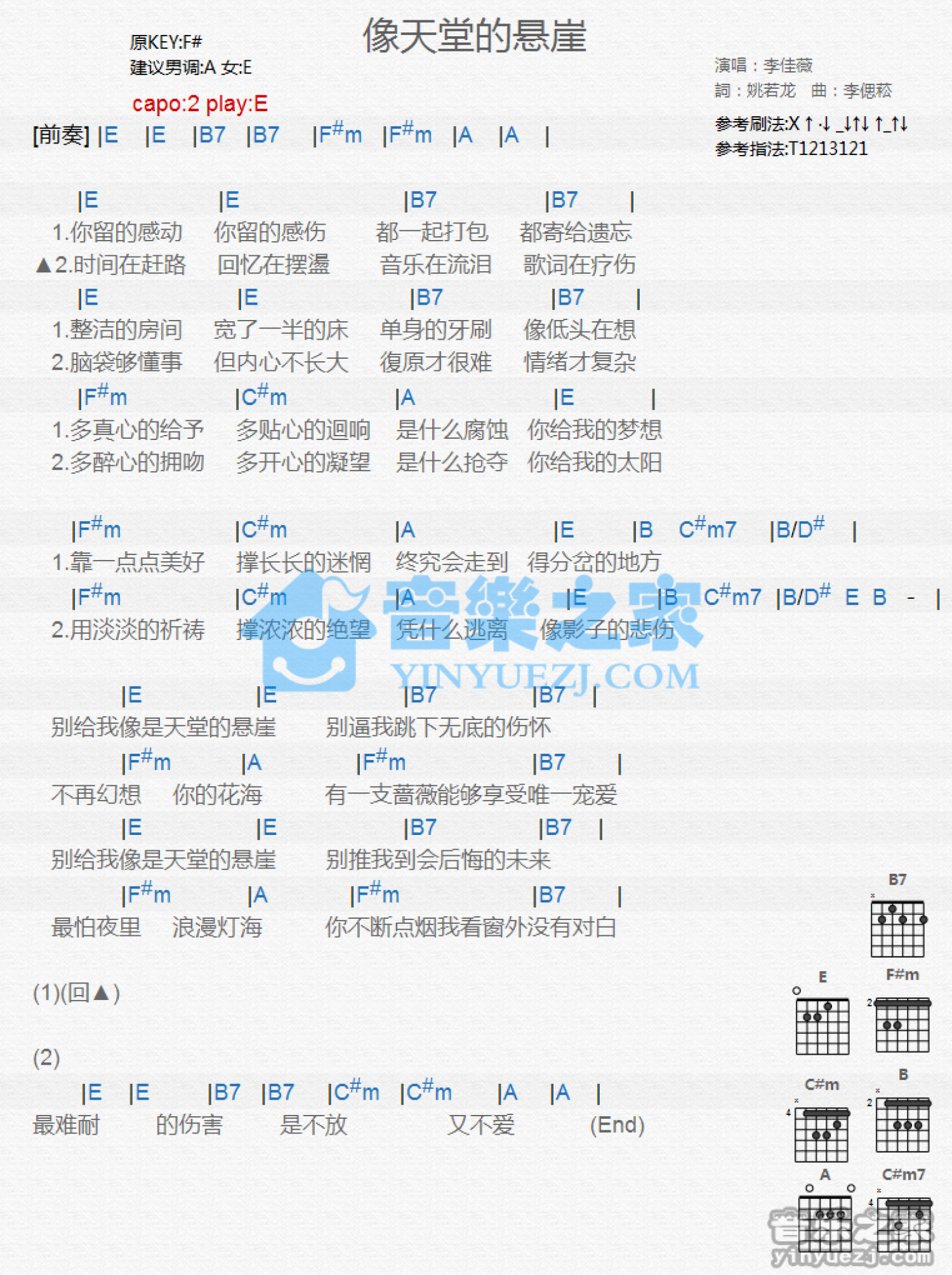 曲谱介绍: E调版《像天堂的悬崖》吉他和弦弹唱谱