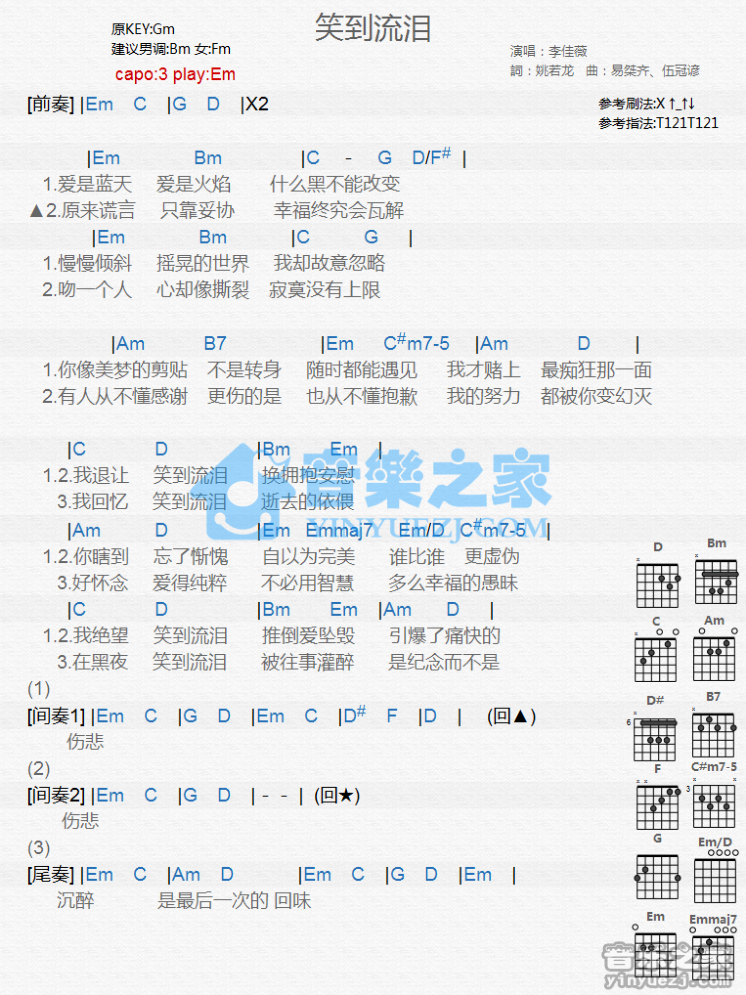 曲谱介绍: Em调版《笑到流泪》吉他和弦弹唱谱