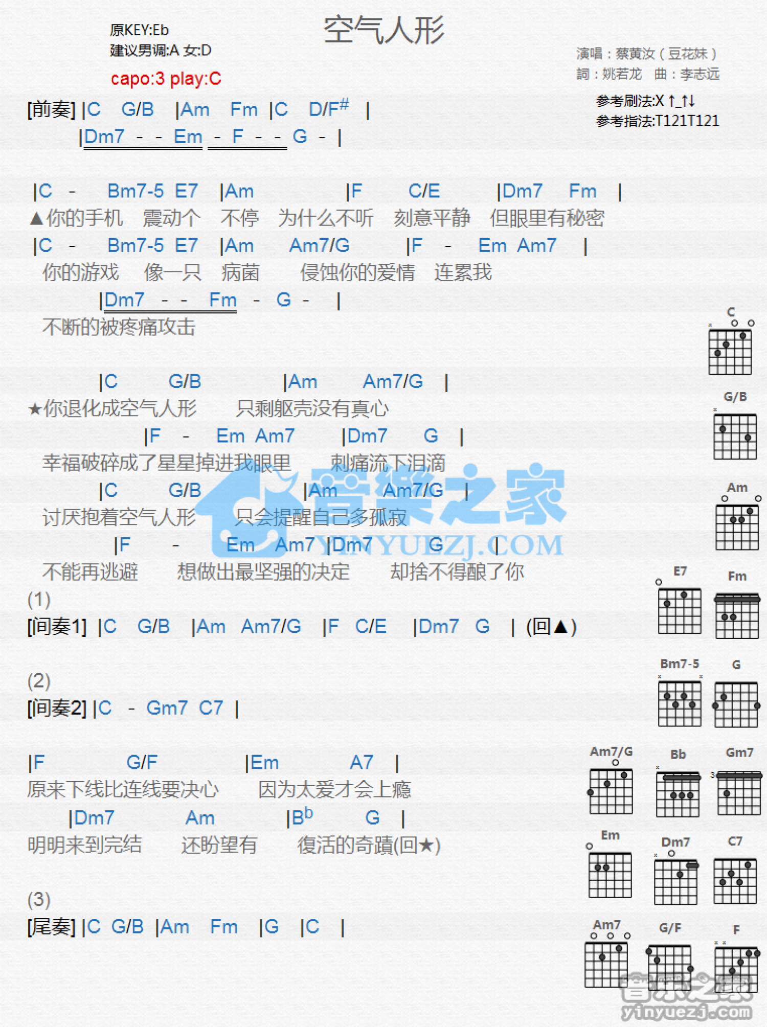 曲谱介绍: C调版《空气人形》吉他和弦弹唱谱