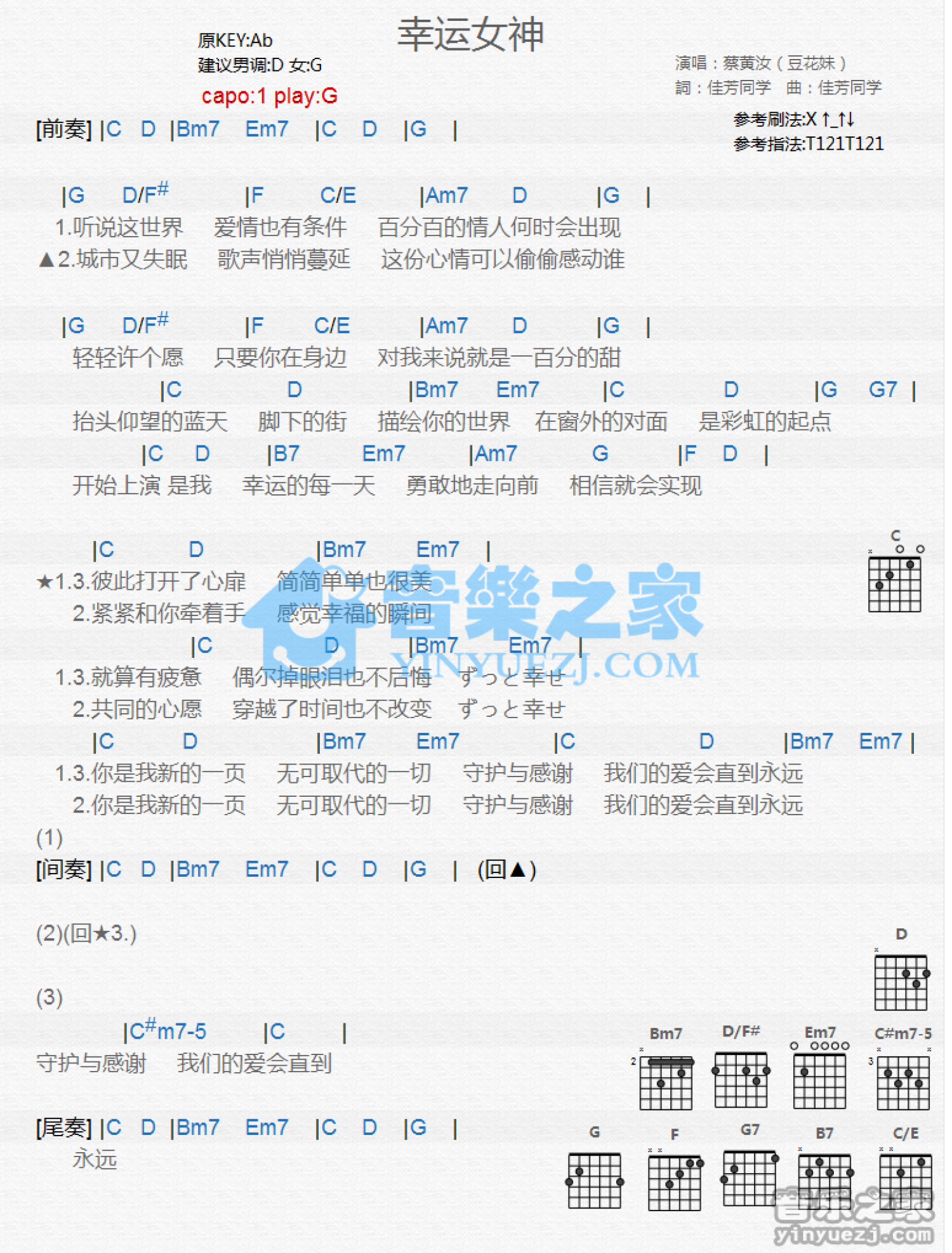 曲谱介绍: G调版《幸运女神》吉他和弦弹唱谱