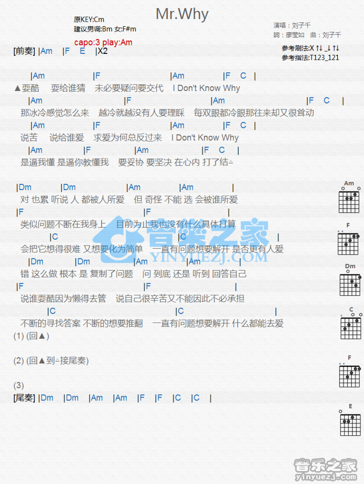 曲谱介绍: Am调版《Mr.Why》吉他和弦弹唱谱