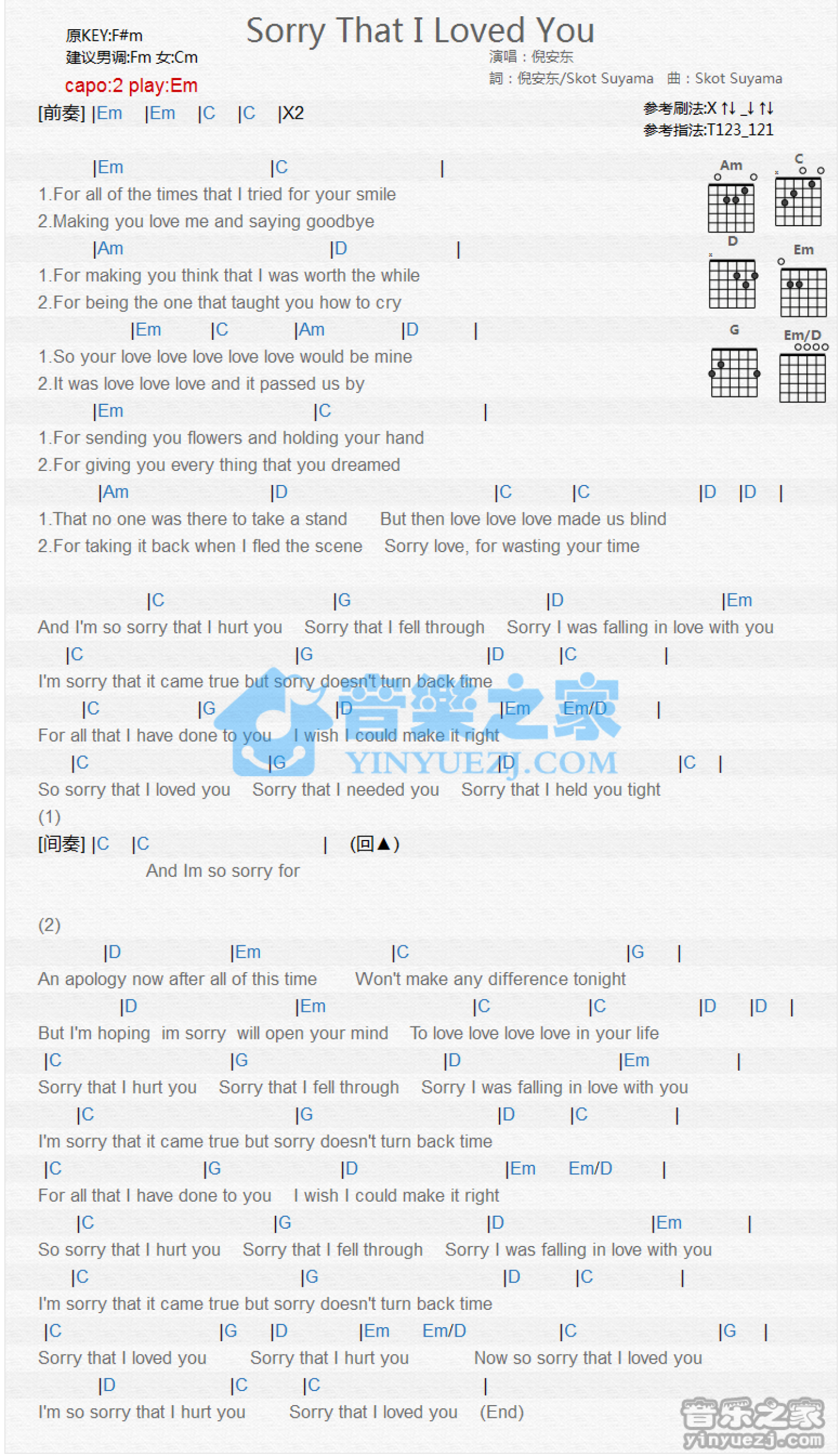 曲谱介绍: Em调版《SorryThatILovedYou》吉他和弦弹唱谱