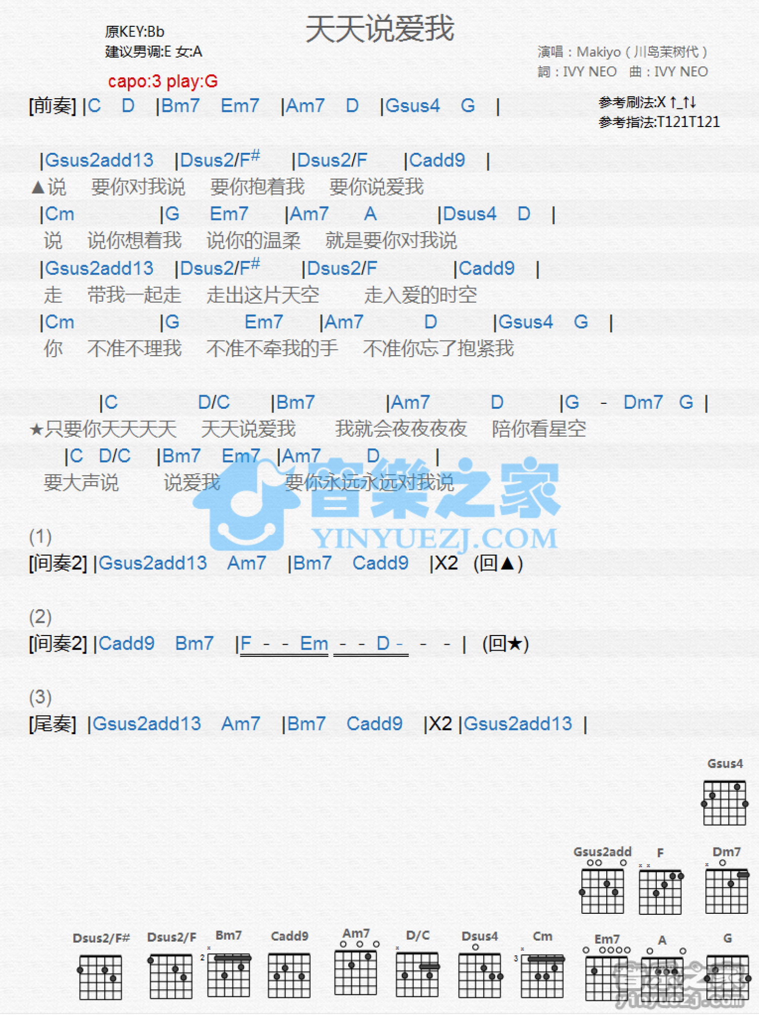 曲谱介绍: G调版《天天说爱我》吉他和弦弹唱谱