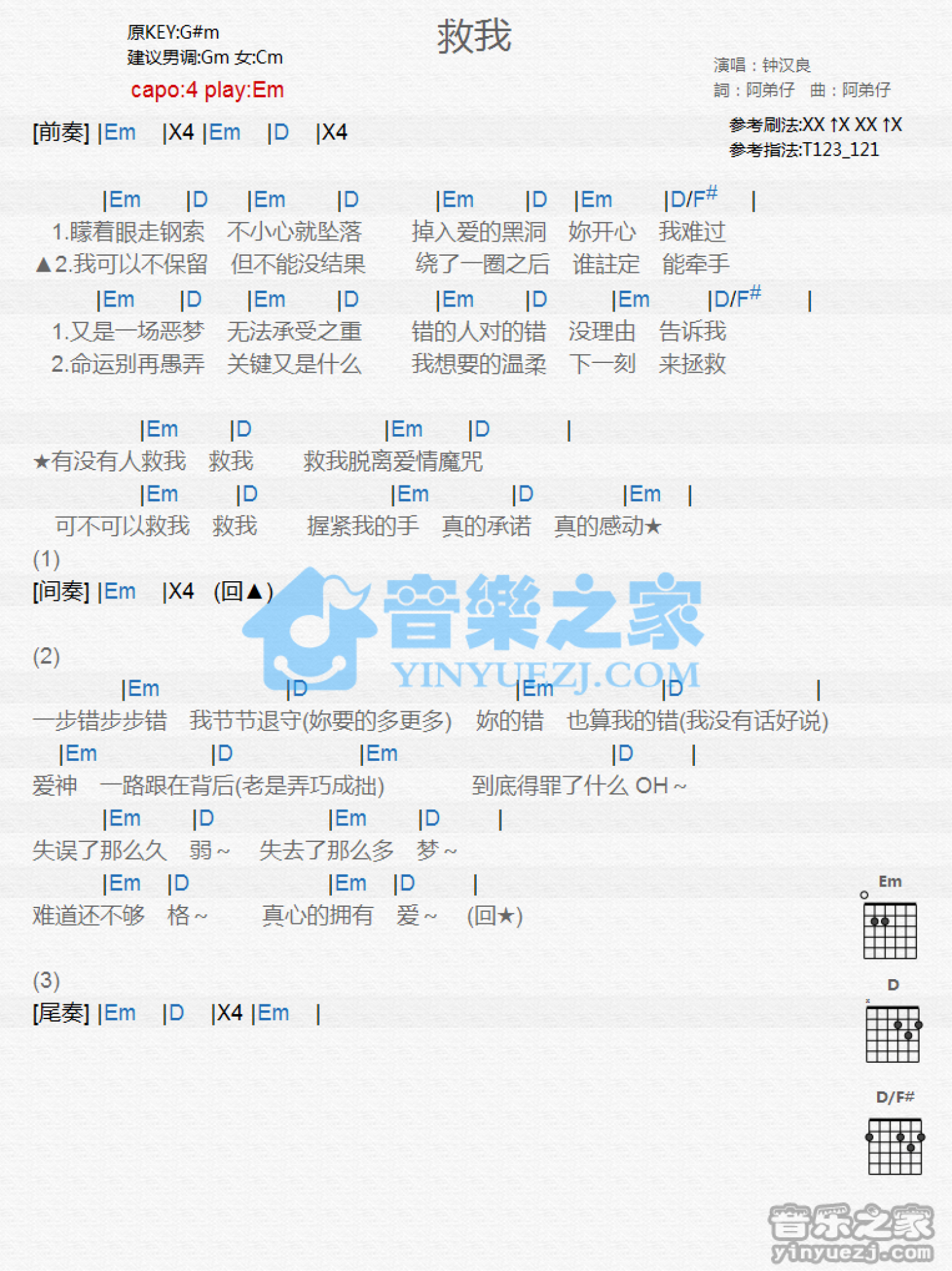 曲谱介绍: Em调版《救我》吉他和弦弹唱谱