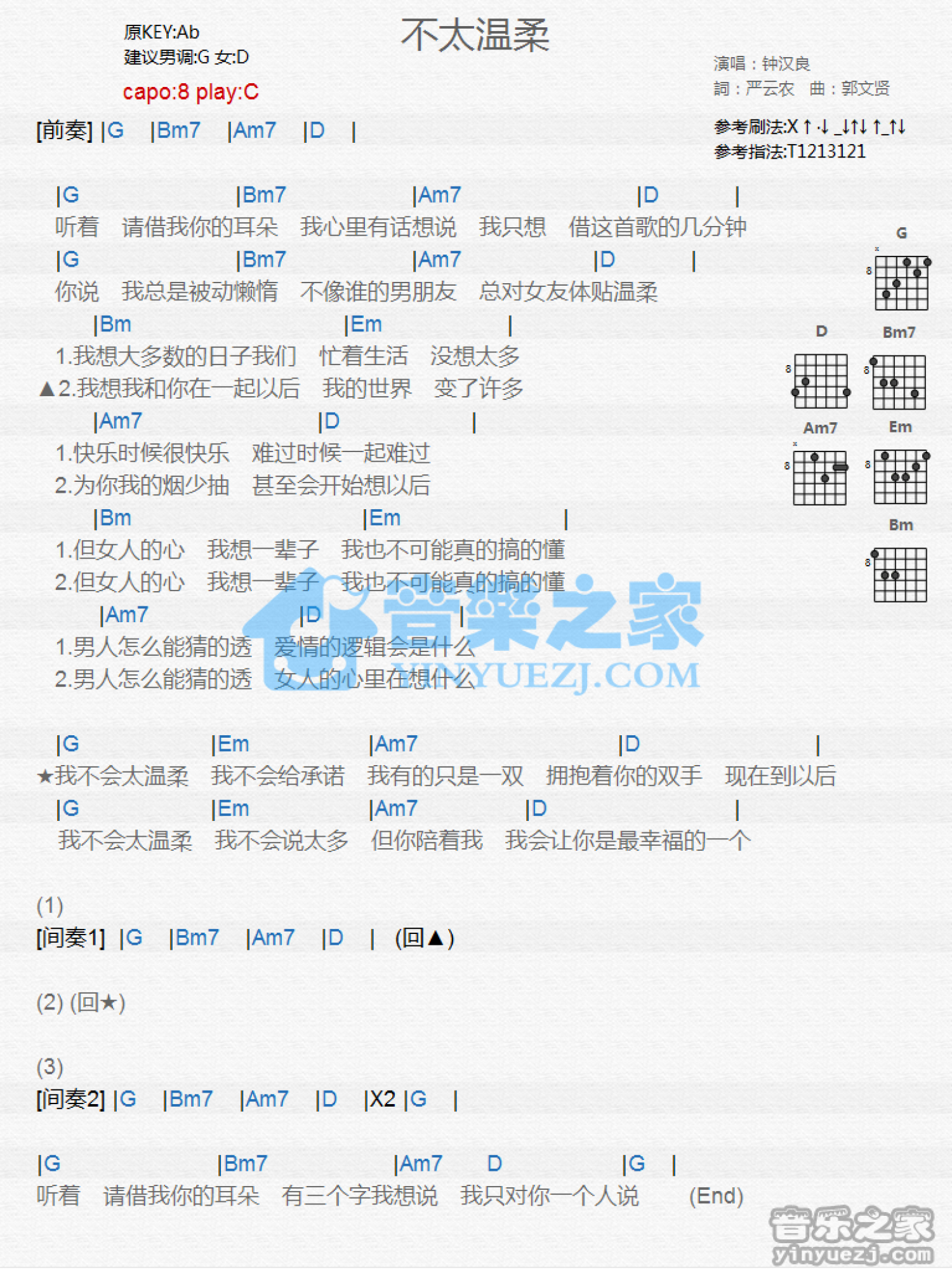 曲谱介绍: C调版《不太温柔》吉他和弦弹唱谱