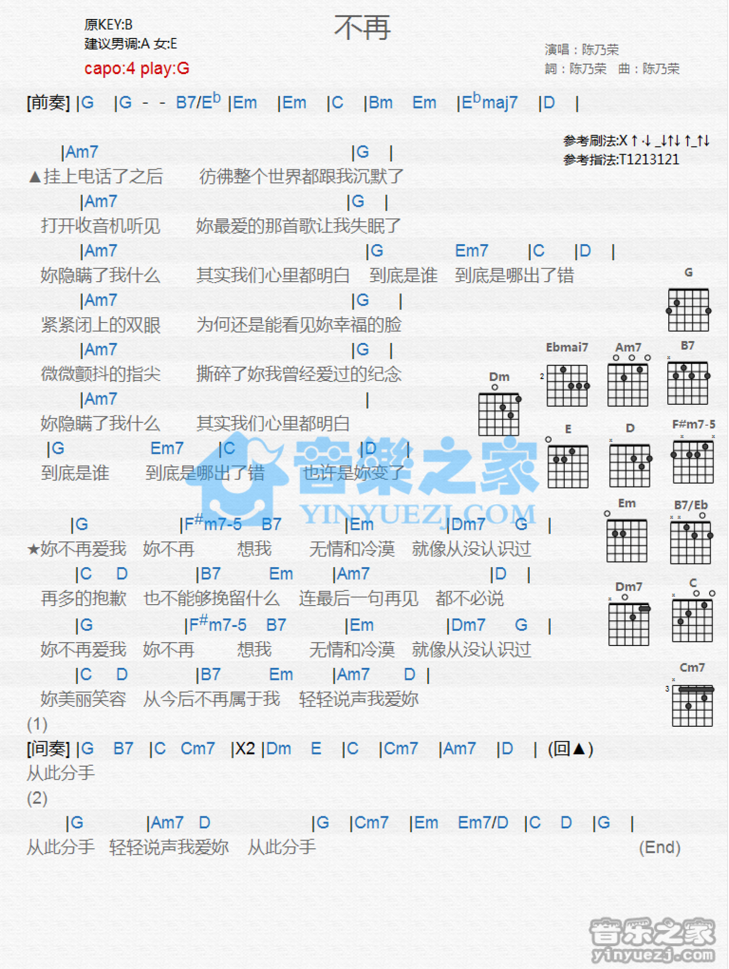 曲谱介绍: G调版《不再》吉他和弦弹唱谱