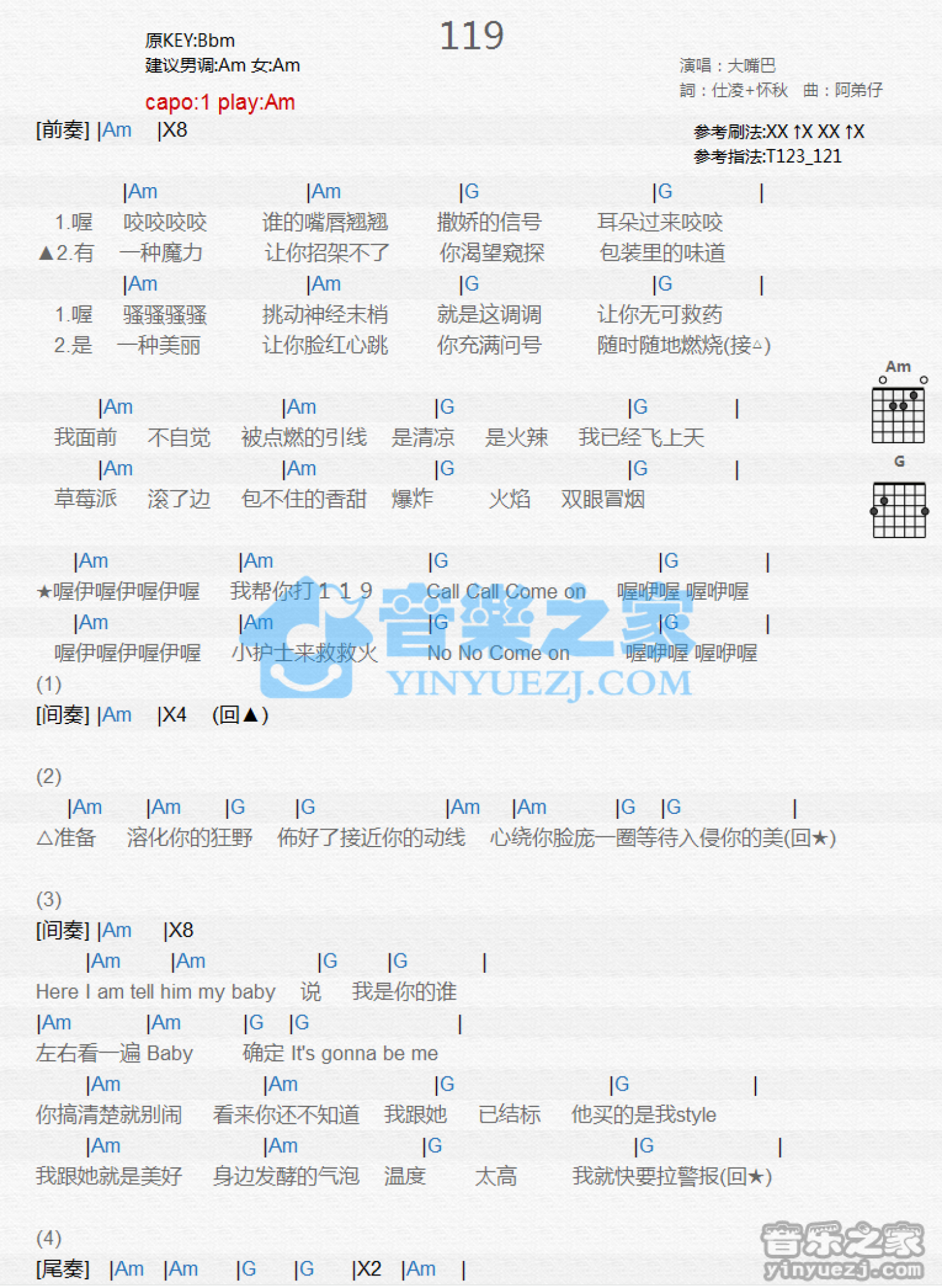曲谱介绍: Am调版《119》吉他和弦弹唱谱