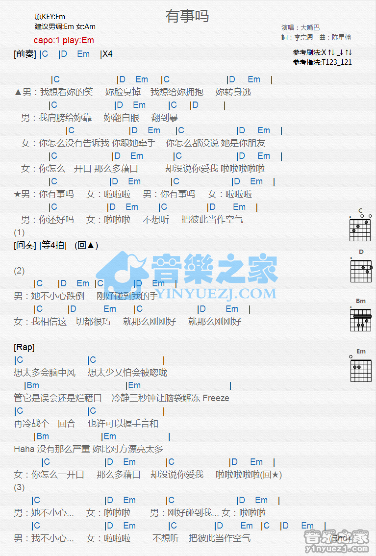 曲谱介绍: Em调版《有事吗》吉他和弦弹唱谱
