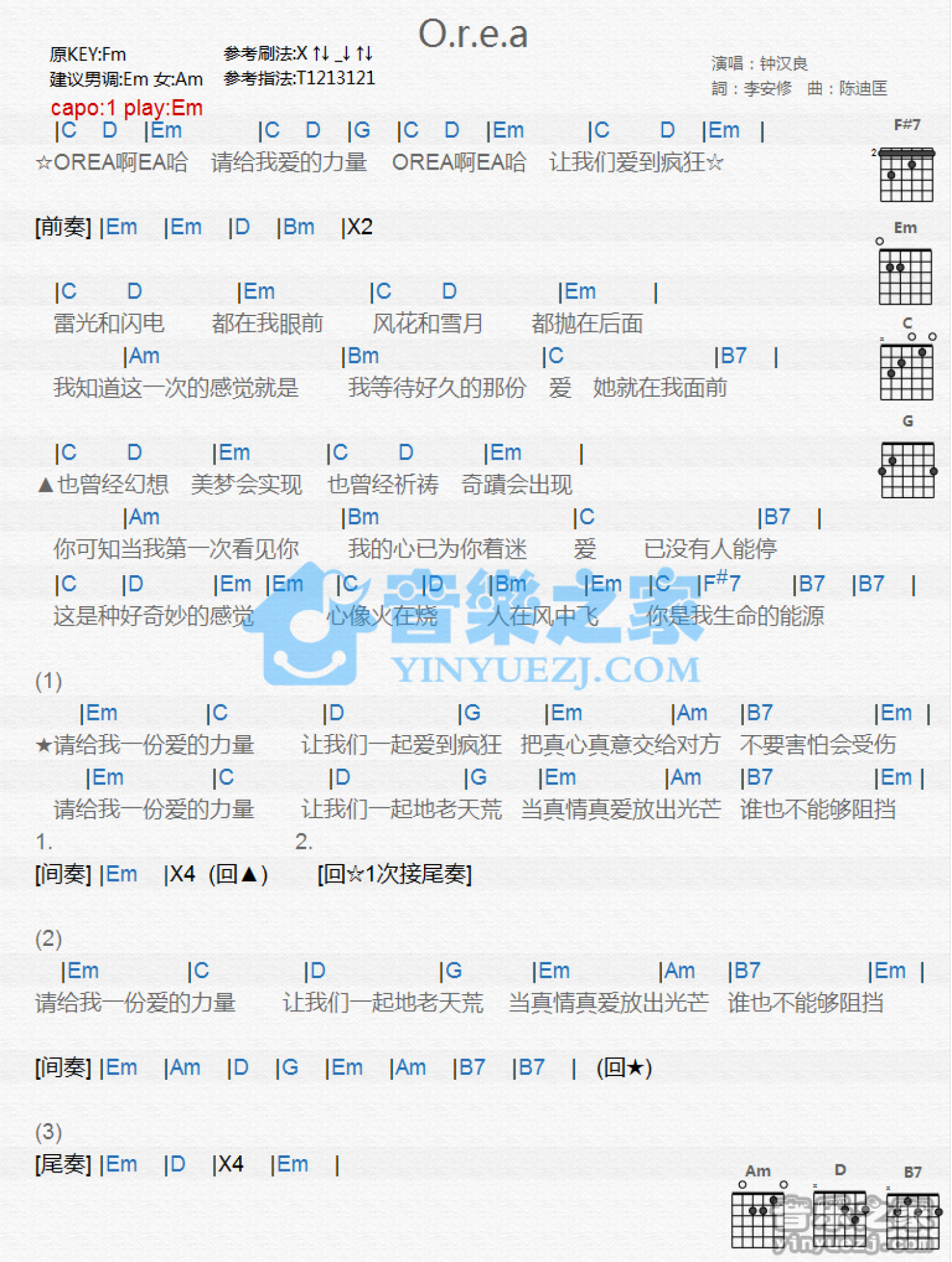 曲谱介绍: Em调版《O.r.e.a》吉他和弦弹唱谱