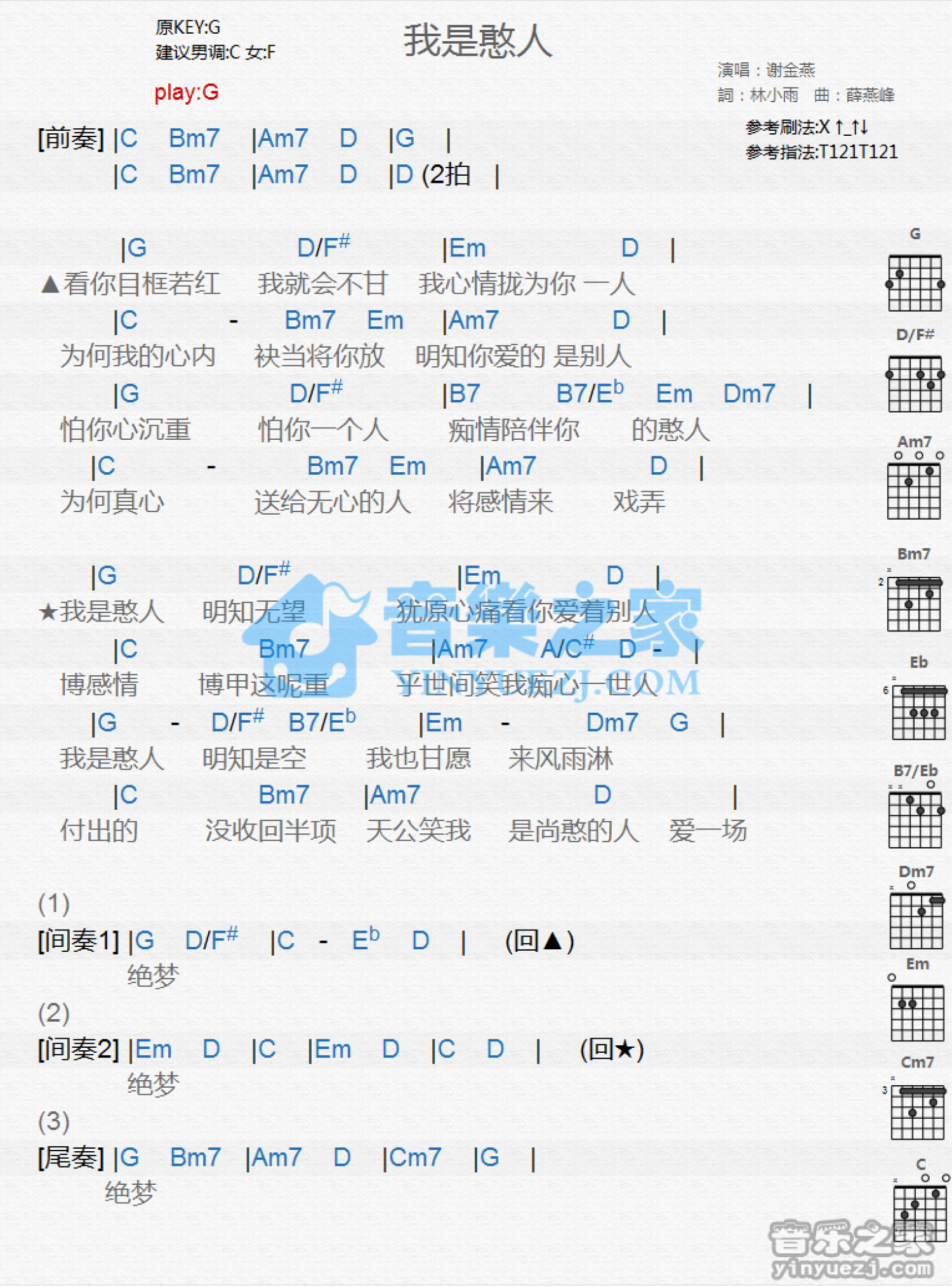 曲谱介绍: G调版 谢金燕《我是憨人》吉他和弦弹唱谱