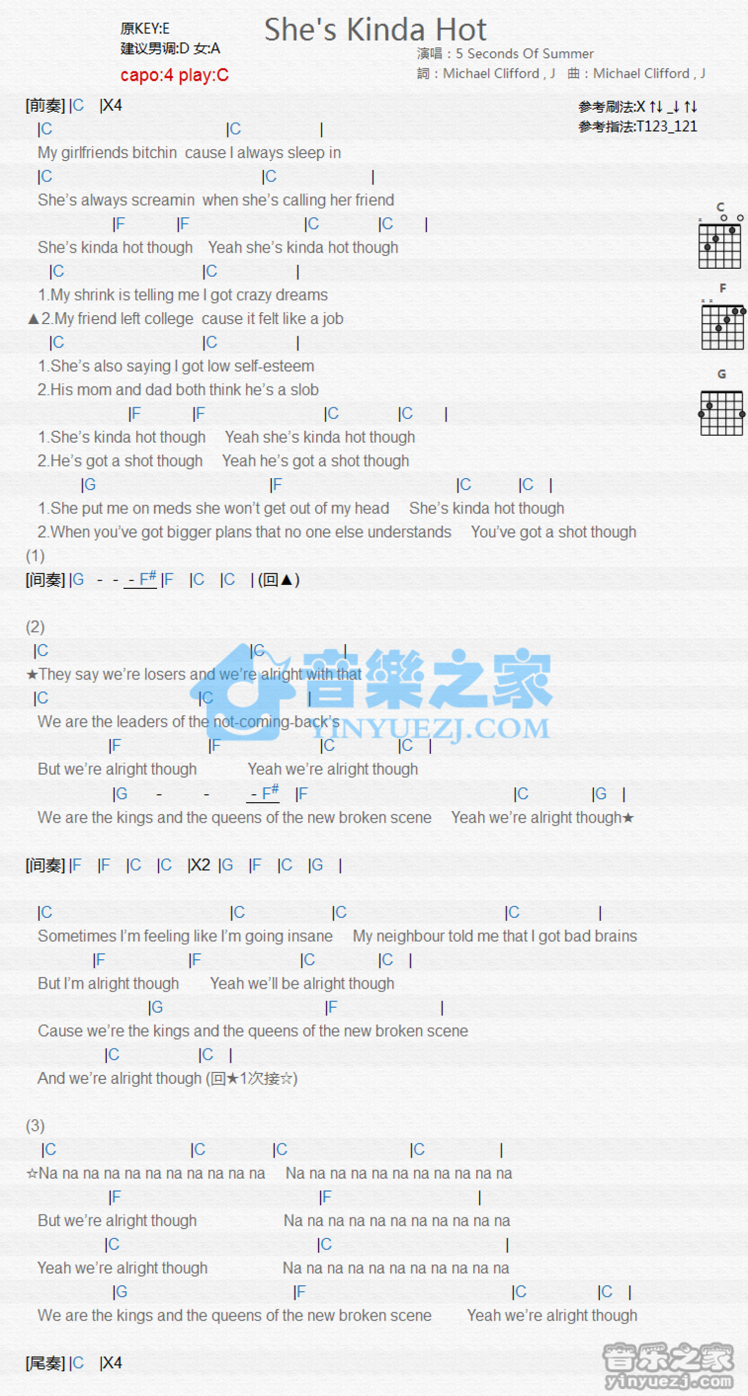 She's Kinda Hot吉他谱 - 5SecondsofSummer - C调吉他弹唱谱 - 和弦谱