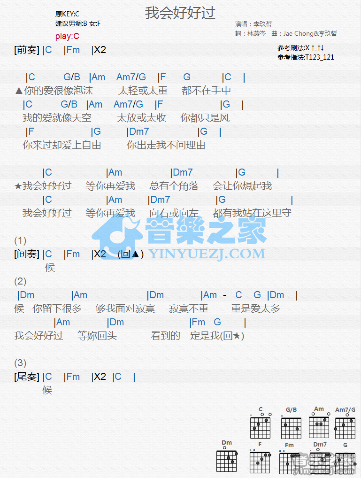 曲谱介绍: C调版《我会好好过》吉他和弦弹唱谱