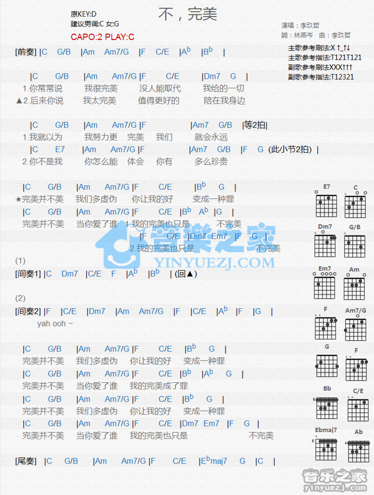 曲谱介绍: C调版《不完美》吉他和弦弹唱谱