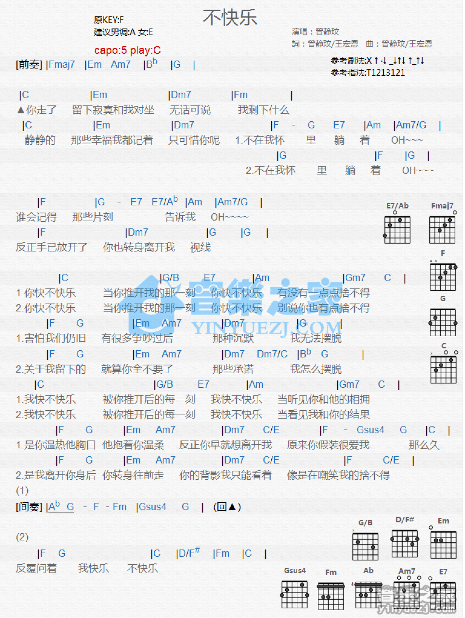 曲谱介绍: C调版《不快乐》吉他和弦弹唱谱
