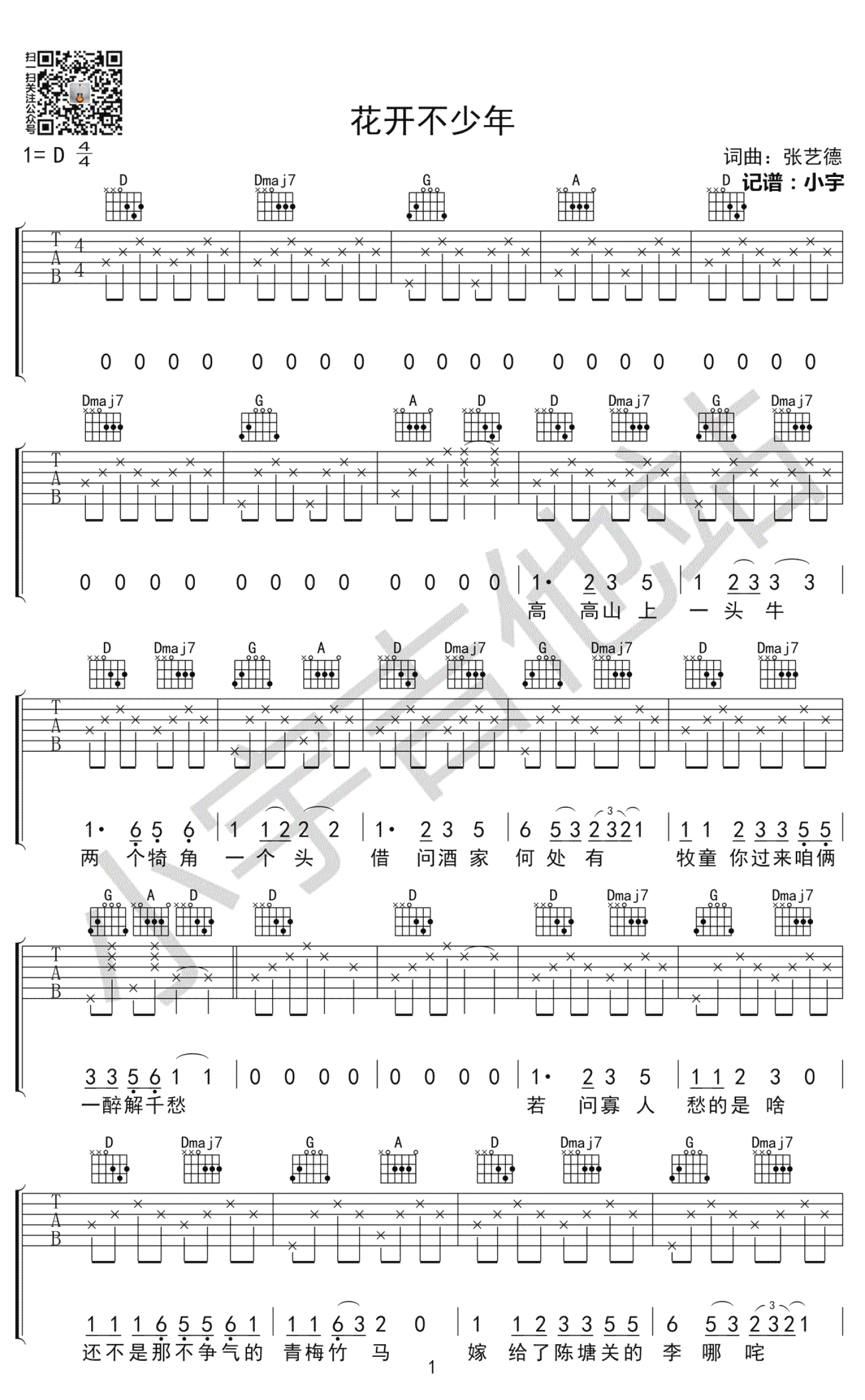 花开不少年吉他谱 - 张艺德 - D调吉他弹唱谱