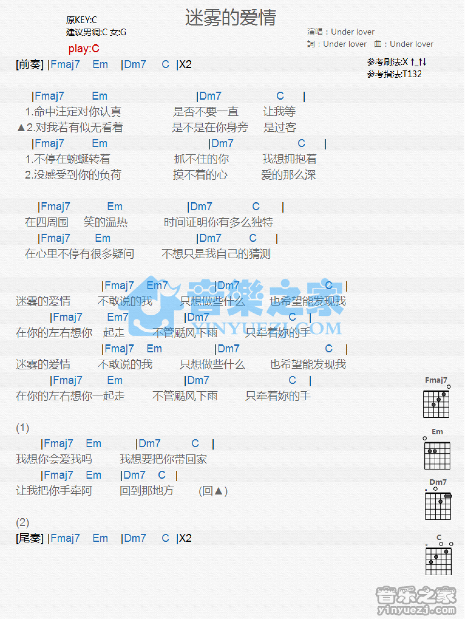 迷雾的爱情吉他谱 - UnderLover - C调吉他弹唱谱 - 和弦谱