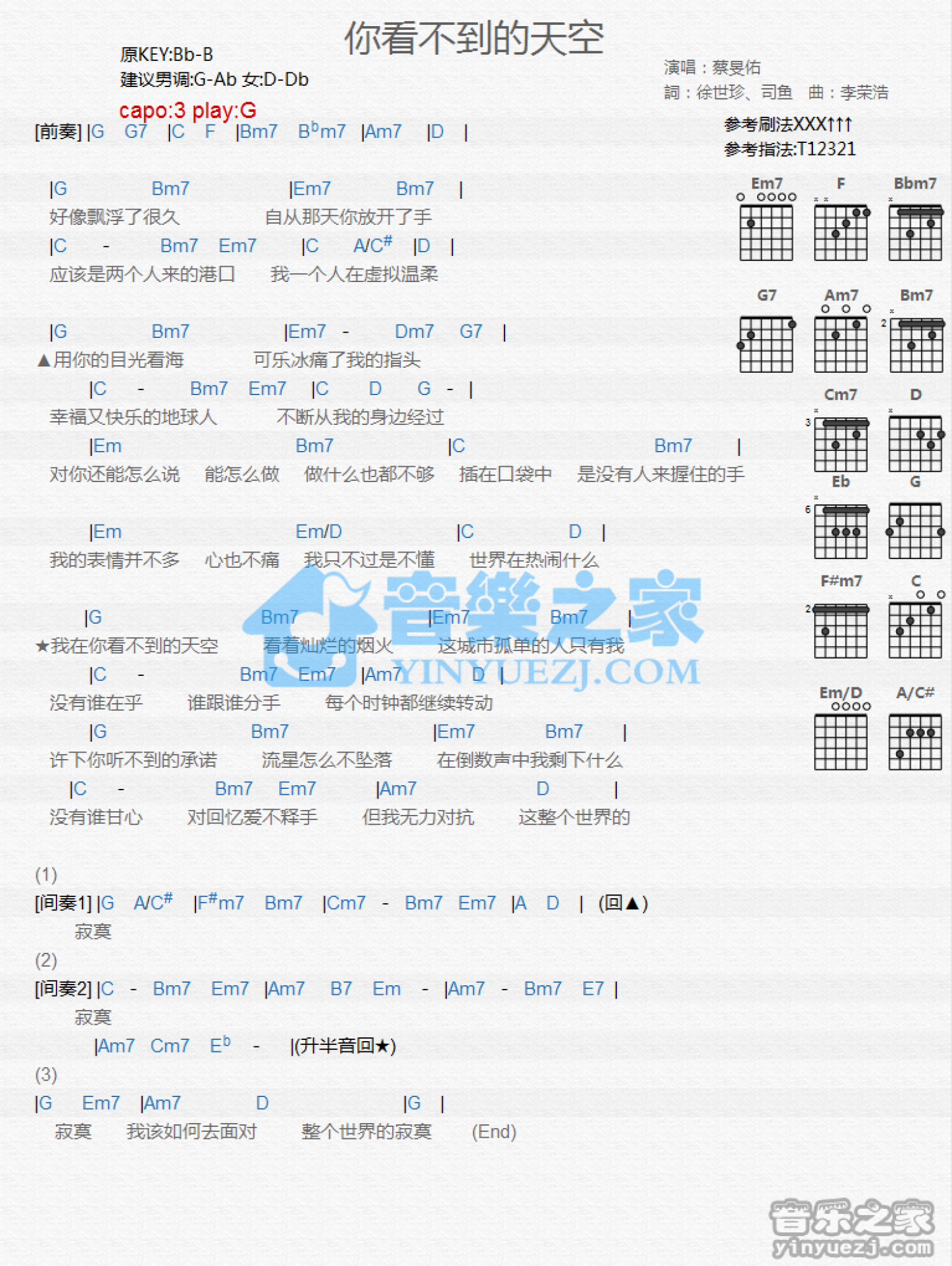 曲谱介绍: G调版蔡旻佑《你看不到的天空》吉他和弦弹唱谱