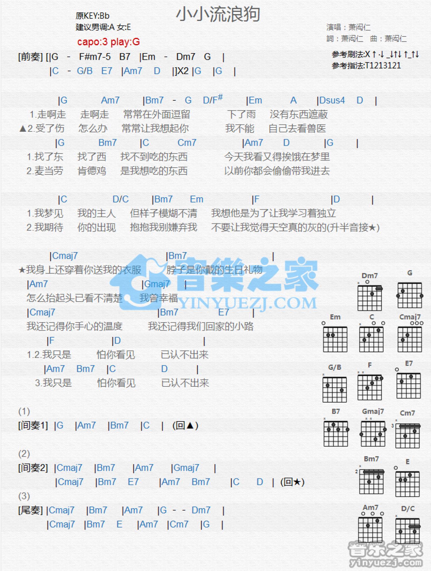曲谱介绍: G调版《小小流浪狗》吉他和弦弹唱谱