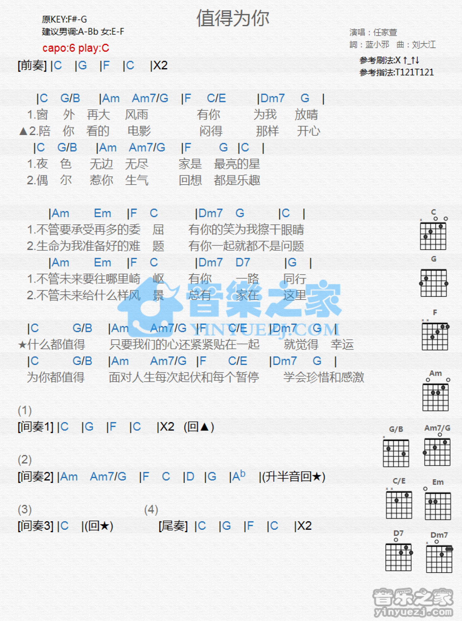 曲谱介绍: C调版《值得为你》吉他和弦弹唱谱