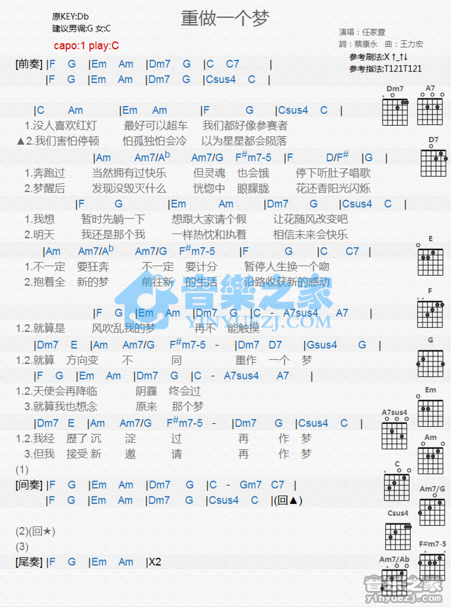 曲谱介绍: C调版《重做一个梦》吉他和弦弹唱谱
