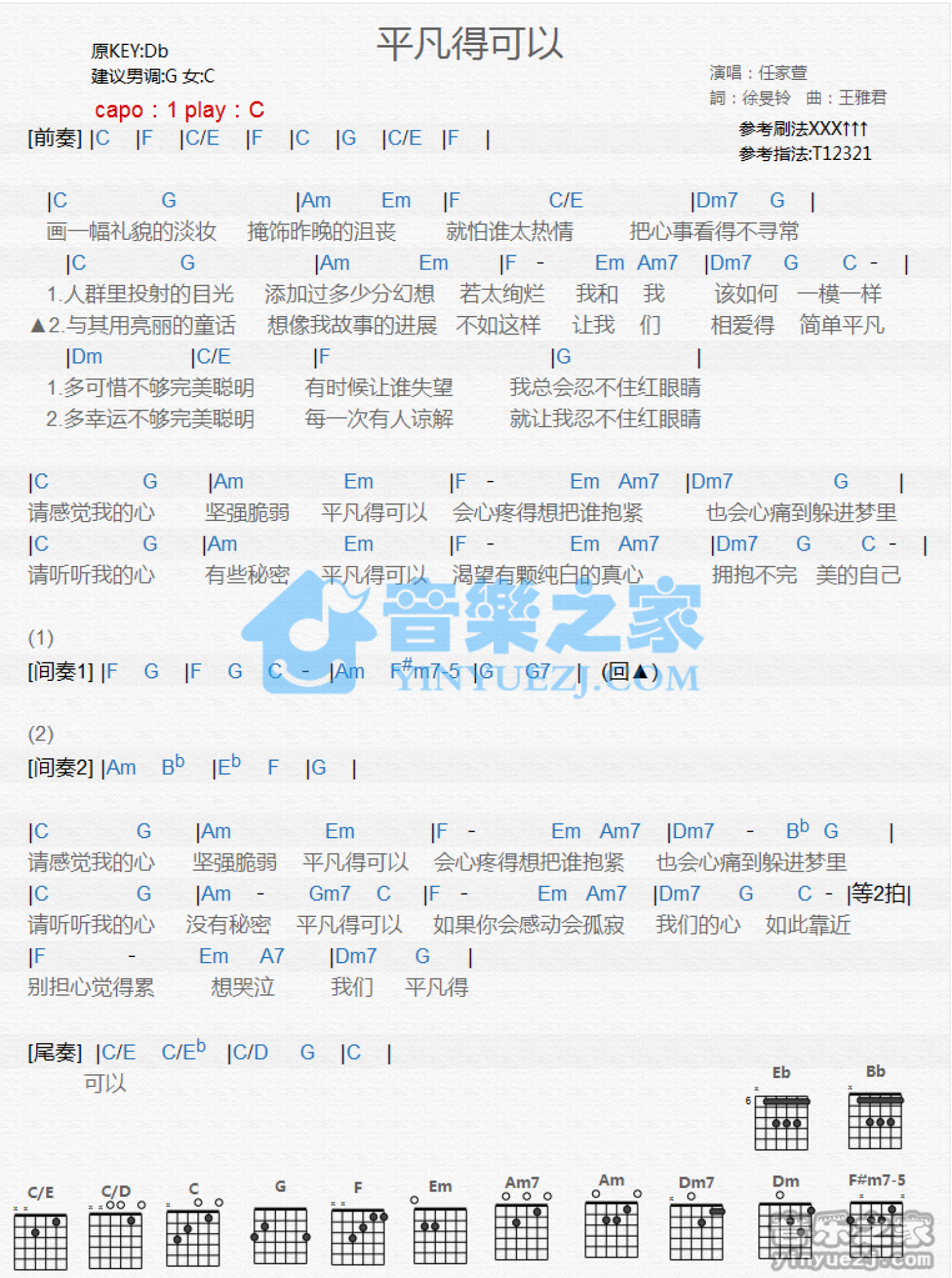 曲谱介绍: C调版 任家萱《平凡得可以》吉他和弦弹唱谱