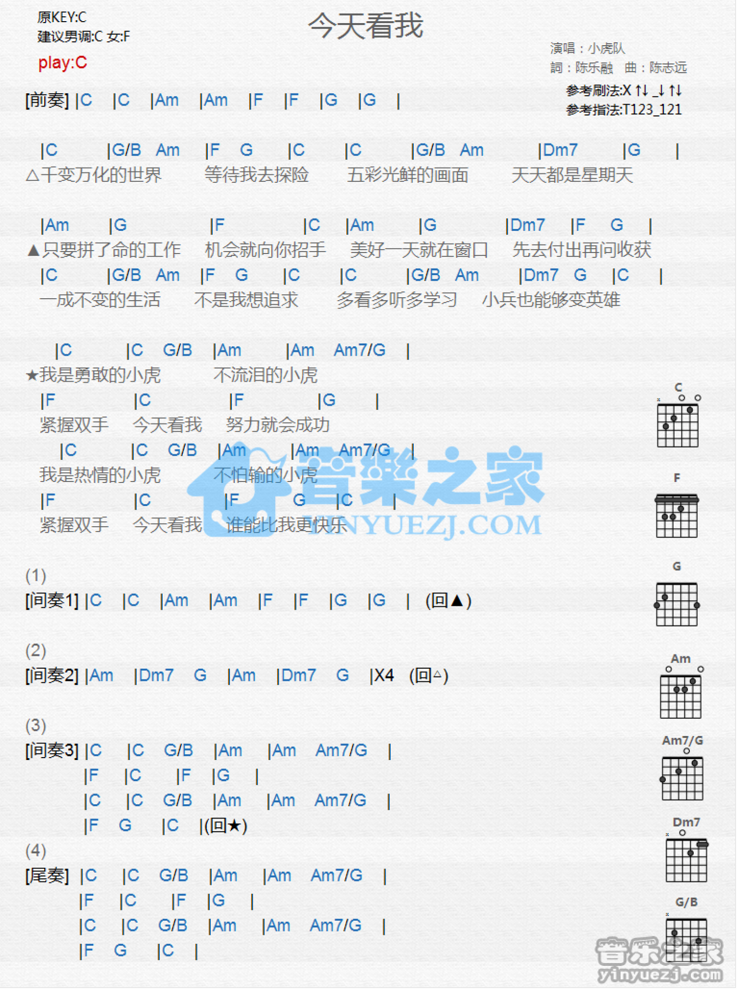 曲谱介绍: C调版《今天看我》吉他和弦弹唱谱