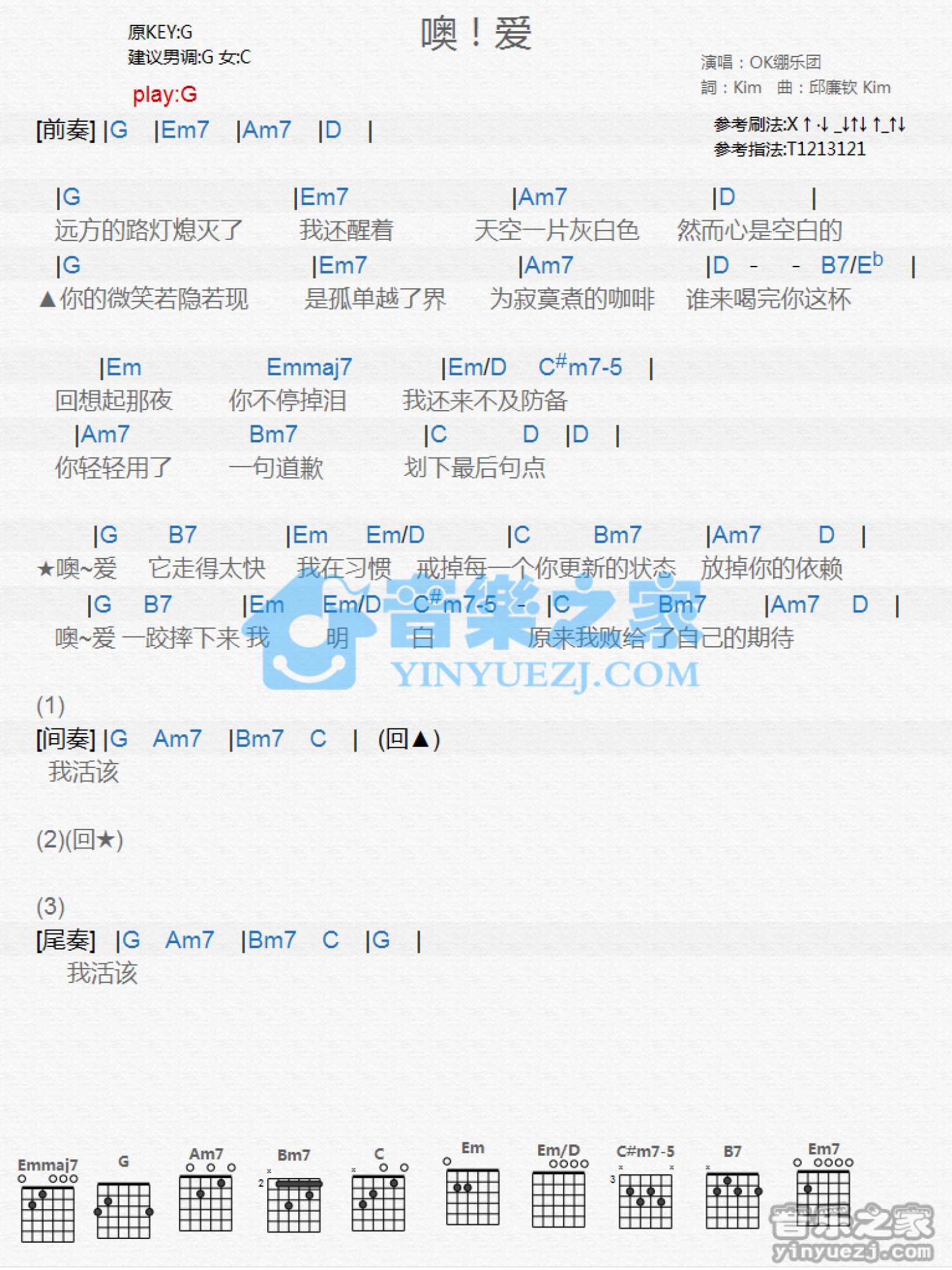 噢爱吉他谱 - OK绷 - G调吉他弹唱谱 - 和弦谱