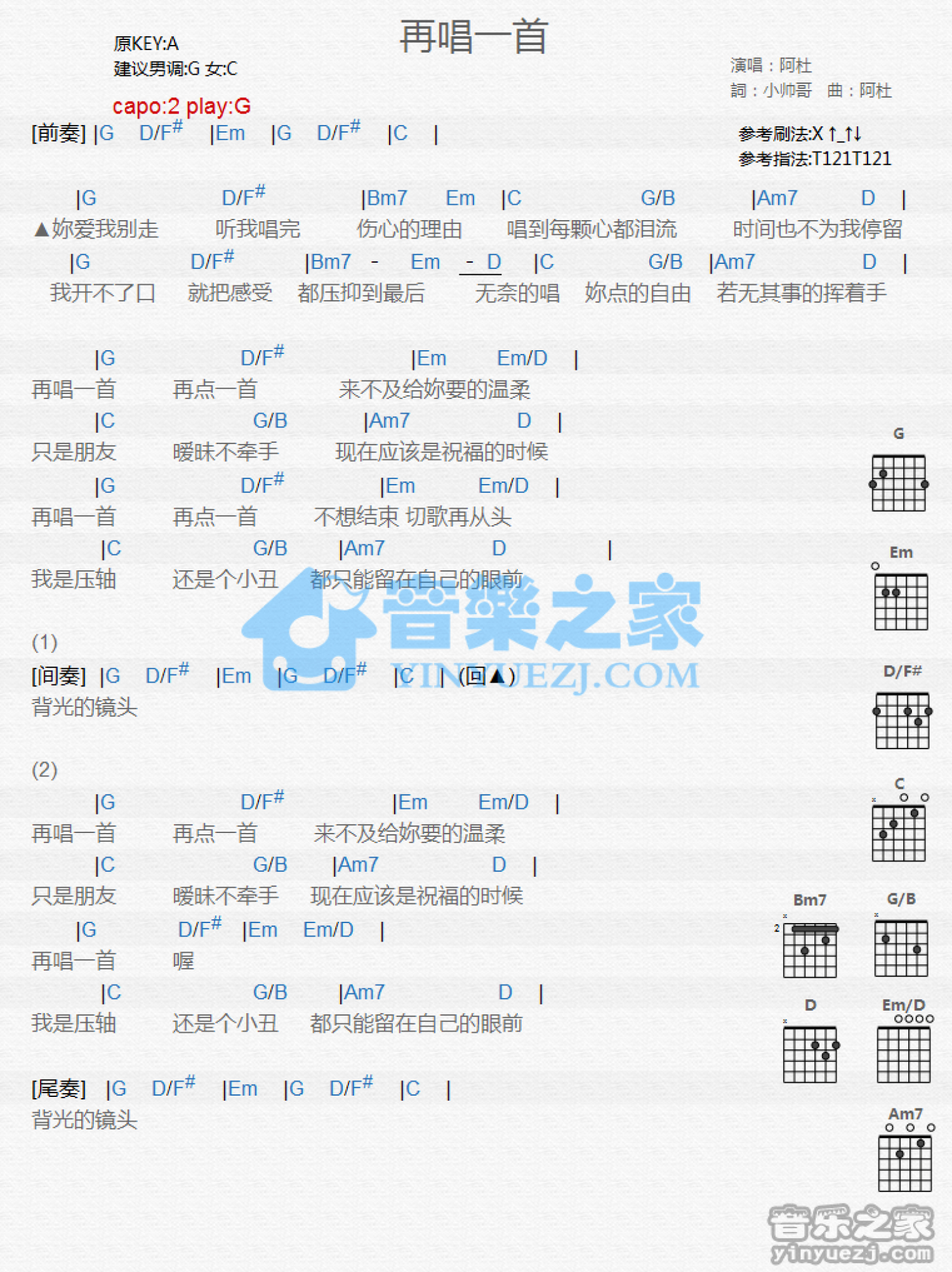 曲谱介绍: G调版《再唱一首》吉他和弦弹唱谱