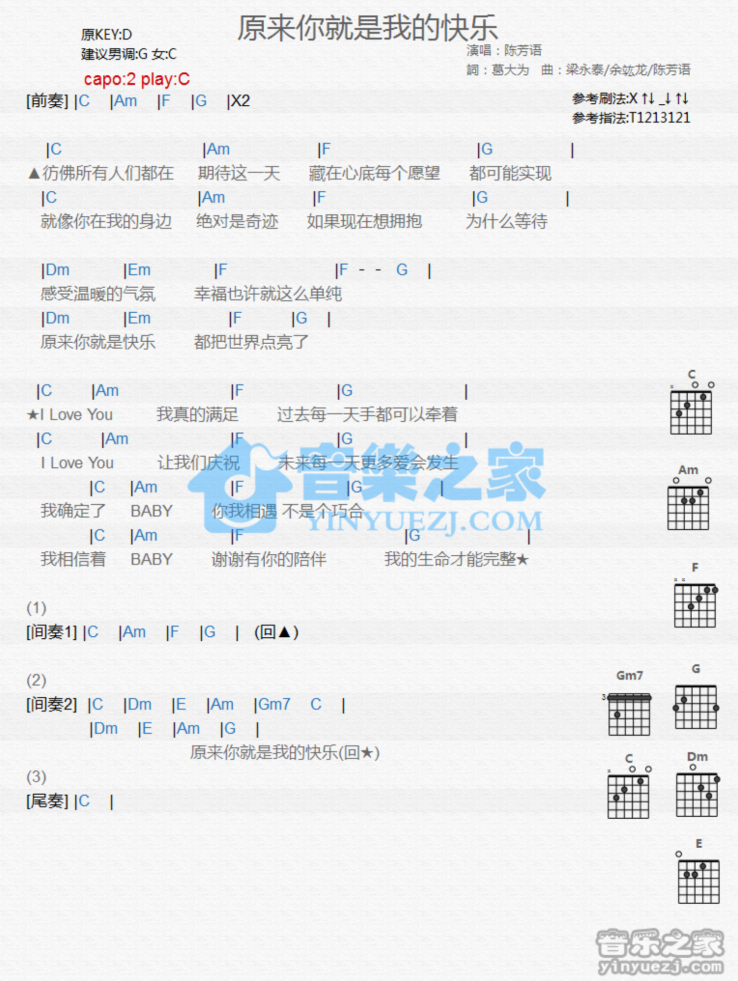 曲谱介绍: C调版《原来你就是我的快乐》吉他和弦弹唱谱