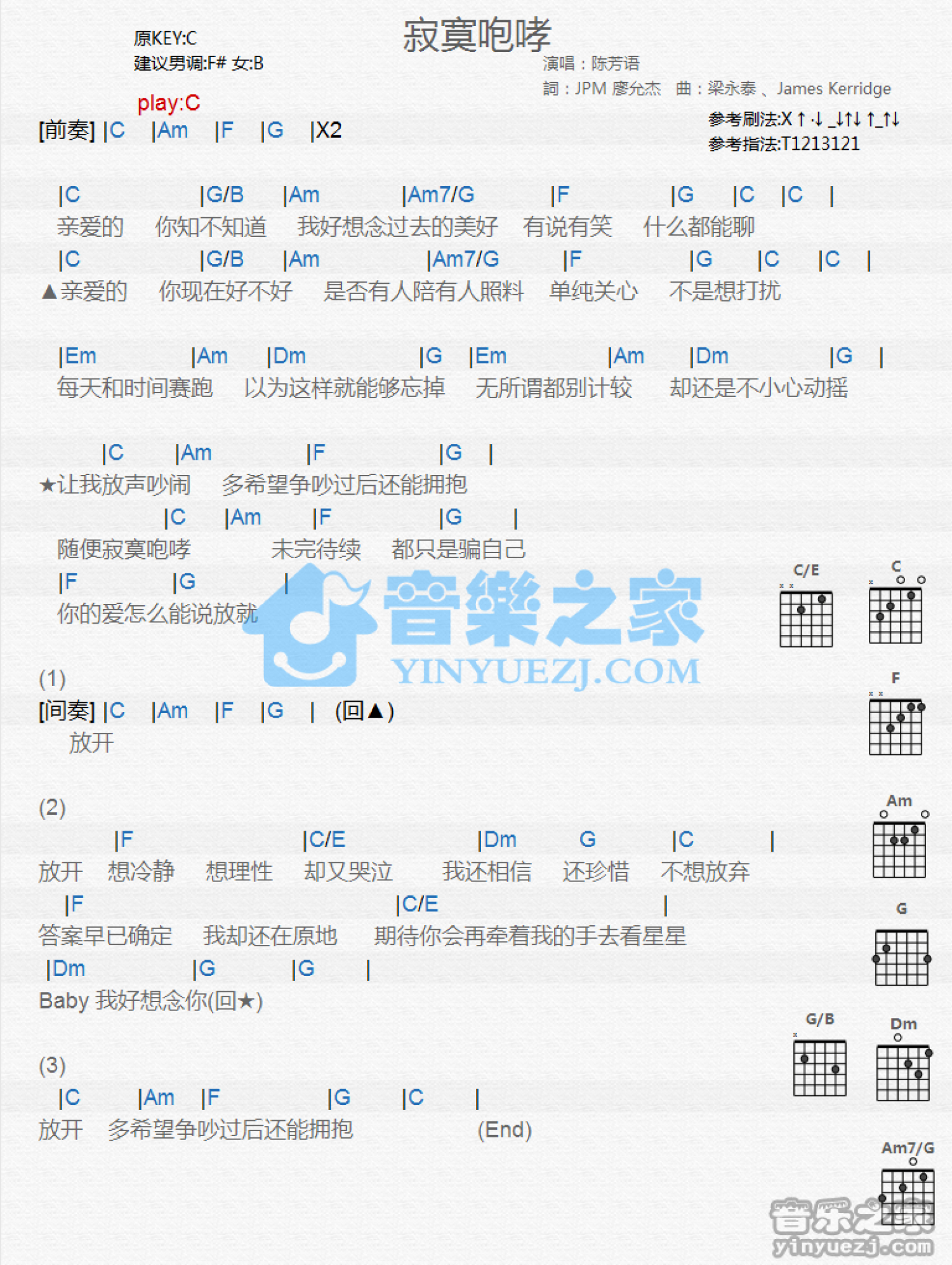 曲谱介绍: C调版《寂寞咆哮》吉他和弦弹唱谱