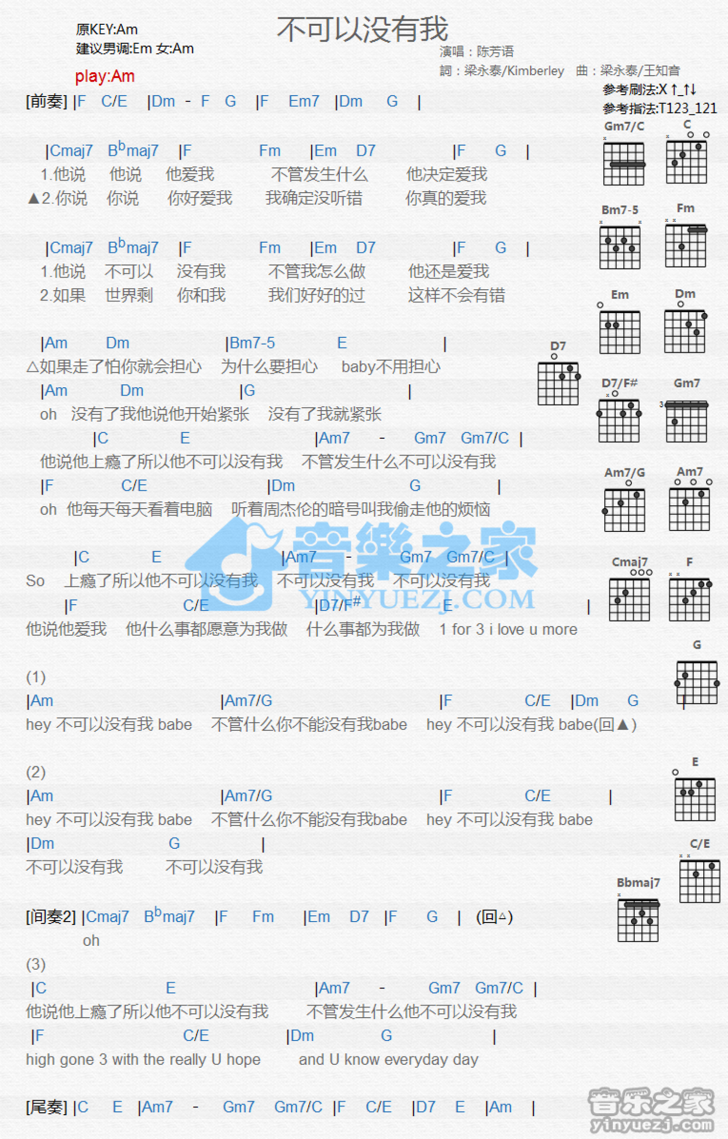 曲谱介绍: Am调版《不可以没有我》吉他和弦弹唱谱