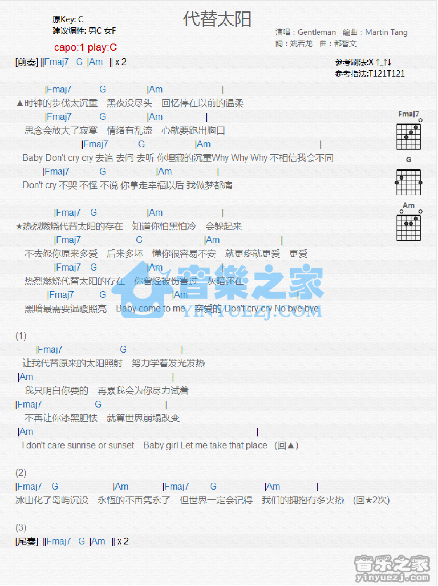 代替太阳吉他谱 - Gentleman - C调吉他弹唱谱 - 和弦谱