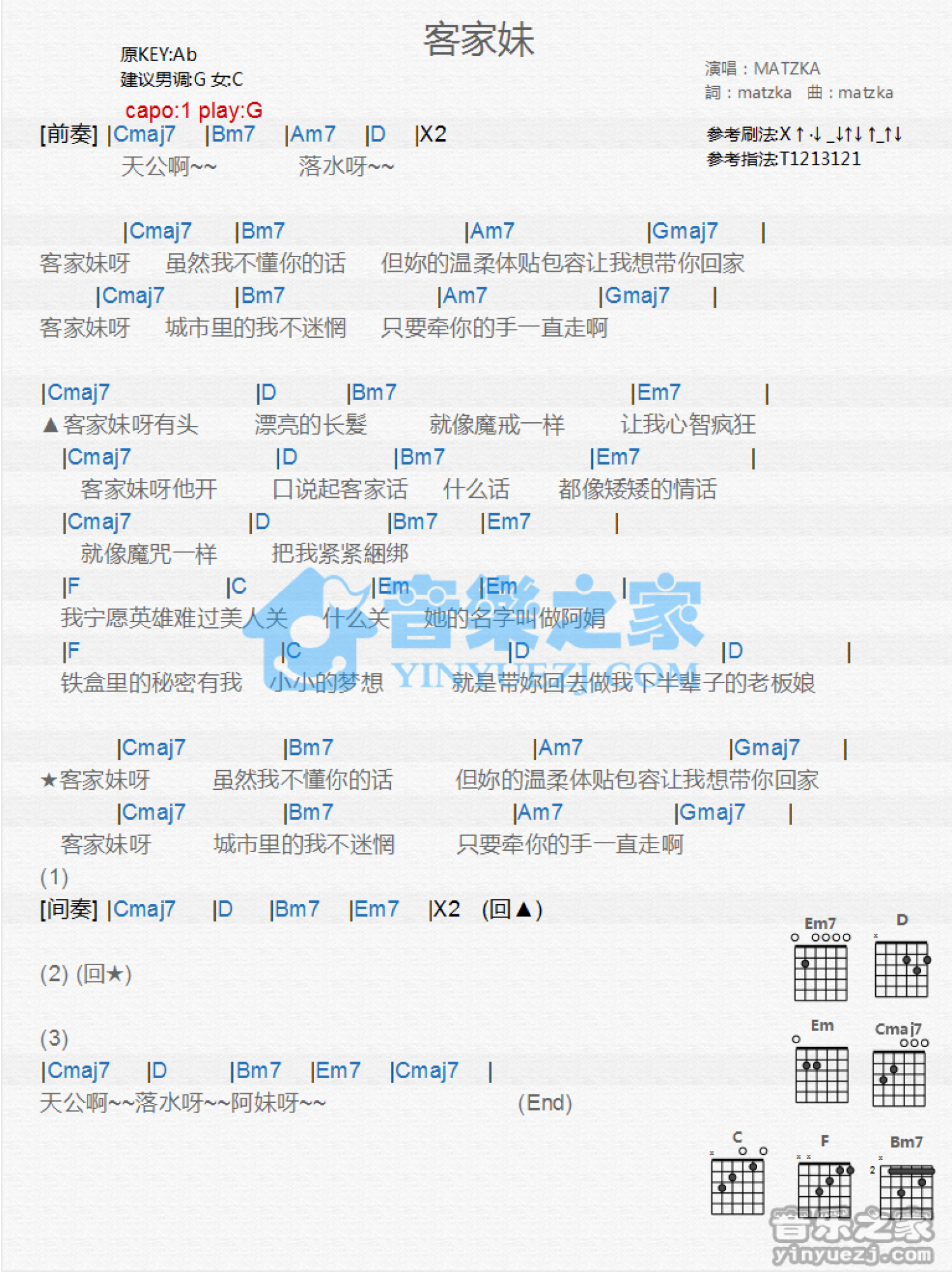 客家妹吉他谱 - MATZKA - G调吉他弹唱谱 - 和弦谱