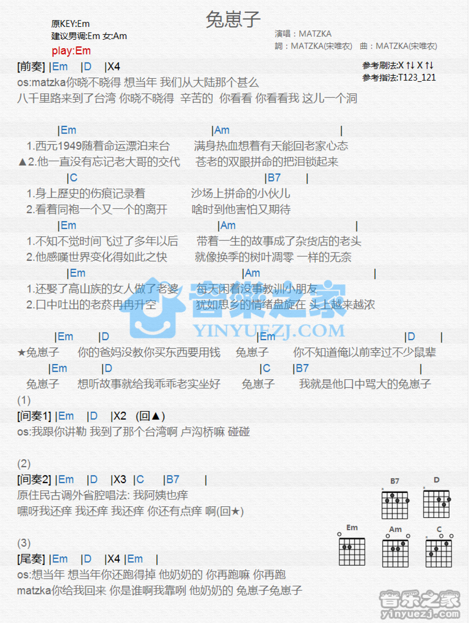 曲谱介绍: Em调版《兔崽子》吉他和弦弹唱谱