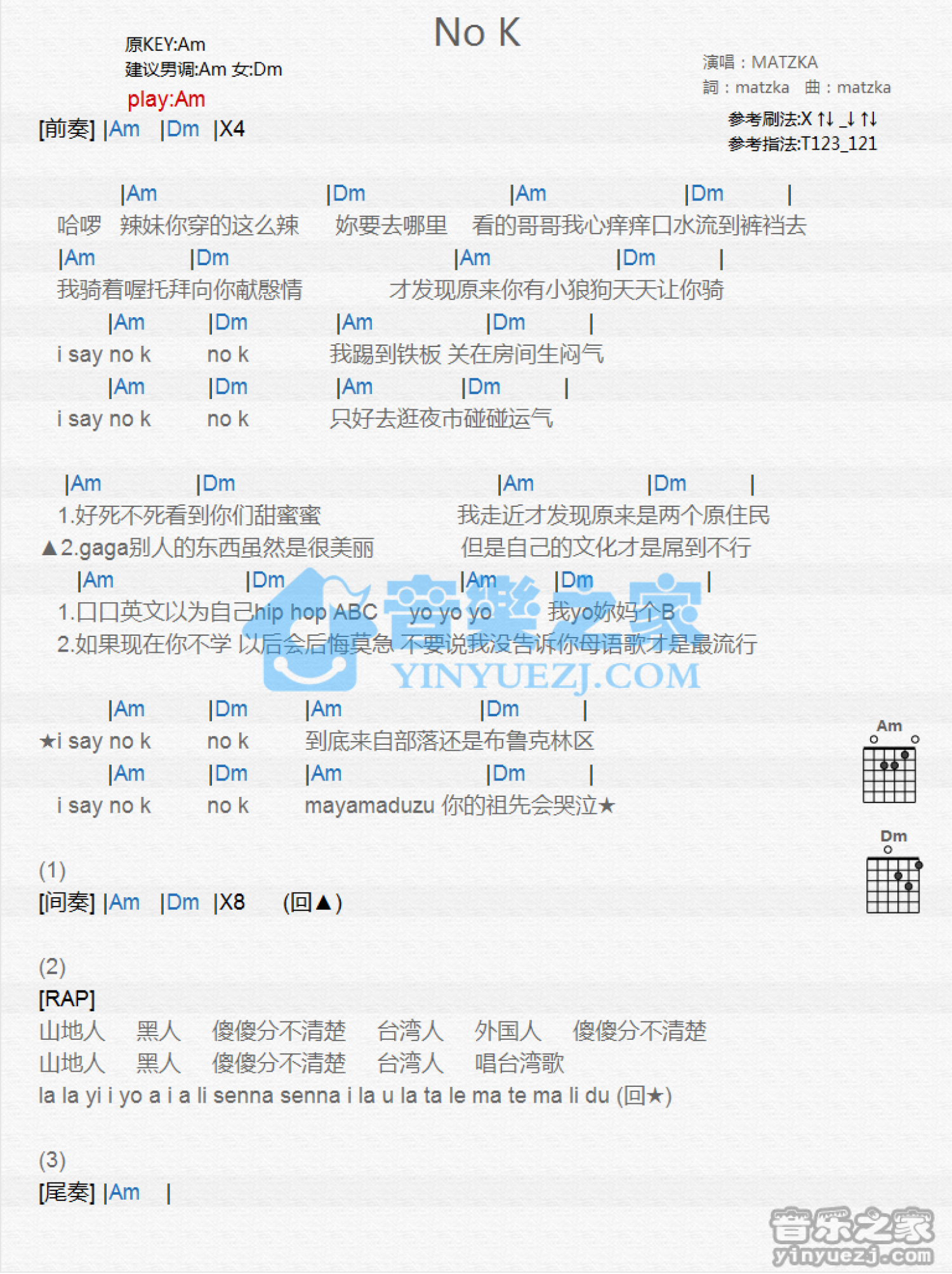 曲谱介绍: Am调版《NoK》吉他和弦弹唱谱