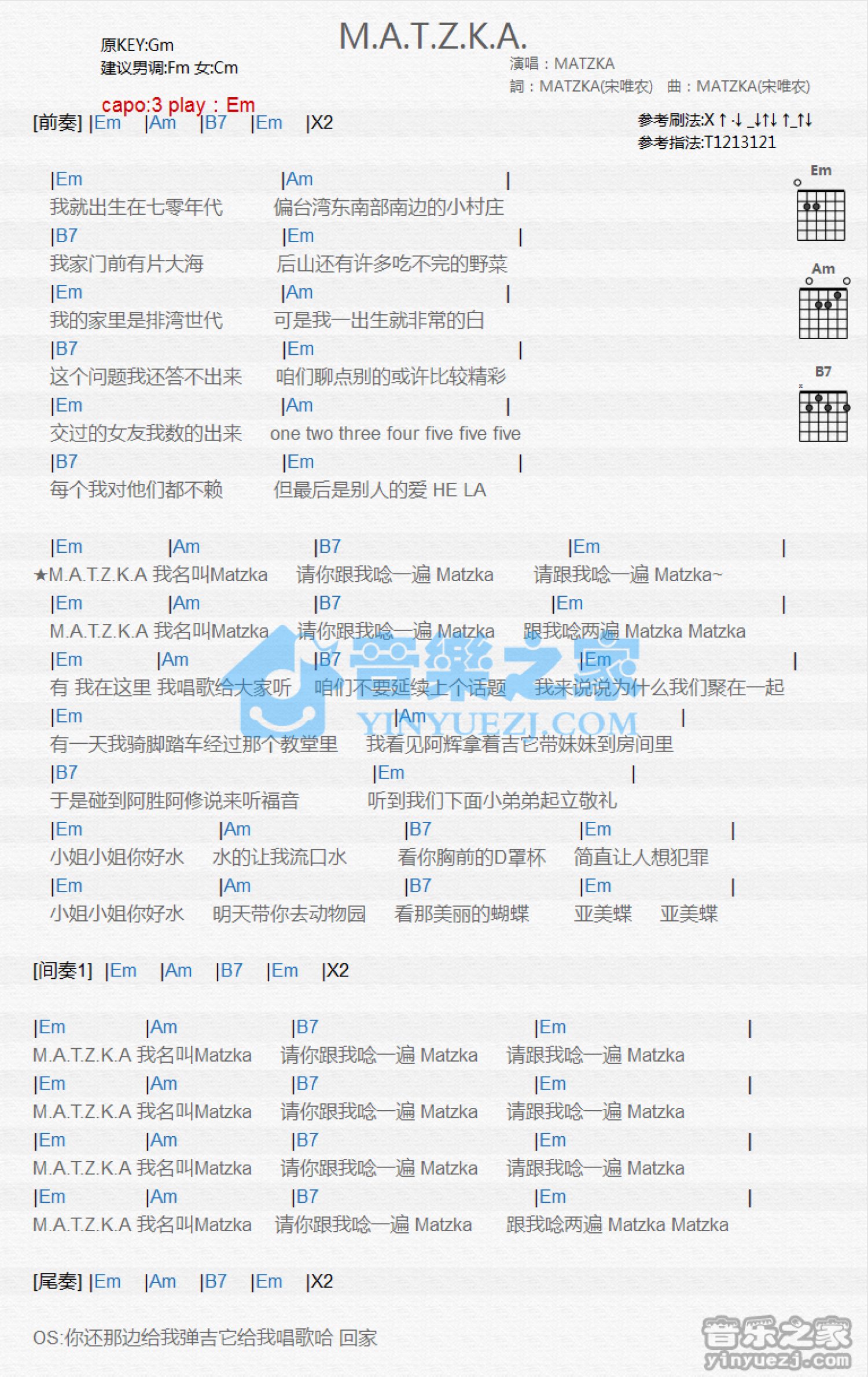 曲谱介绍: Em调版《M.A.T.Z.K.A.》吉他和弦弹唱谱