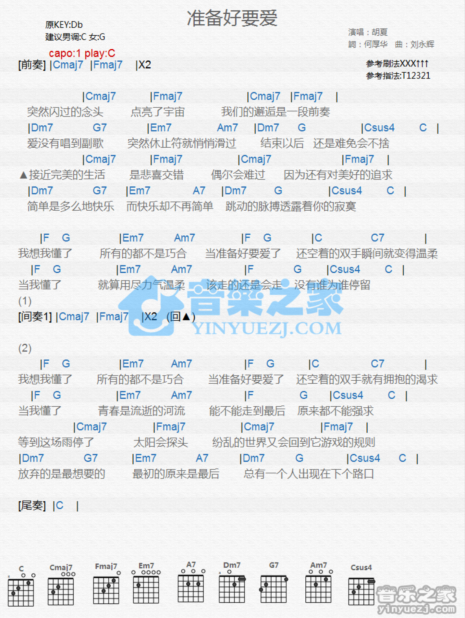 曲谱介绍: C调版《准备好要爱》吉他和弦弹唱谱