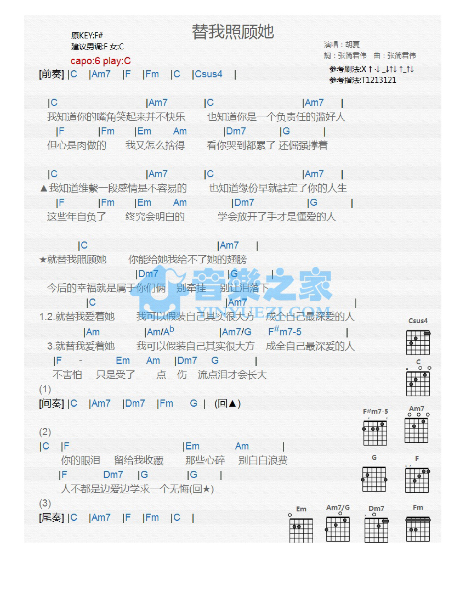曲谱介绍: C调版《替我照顾她》吉他和弦弹唱谱