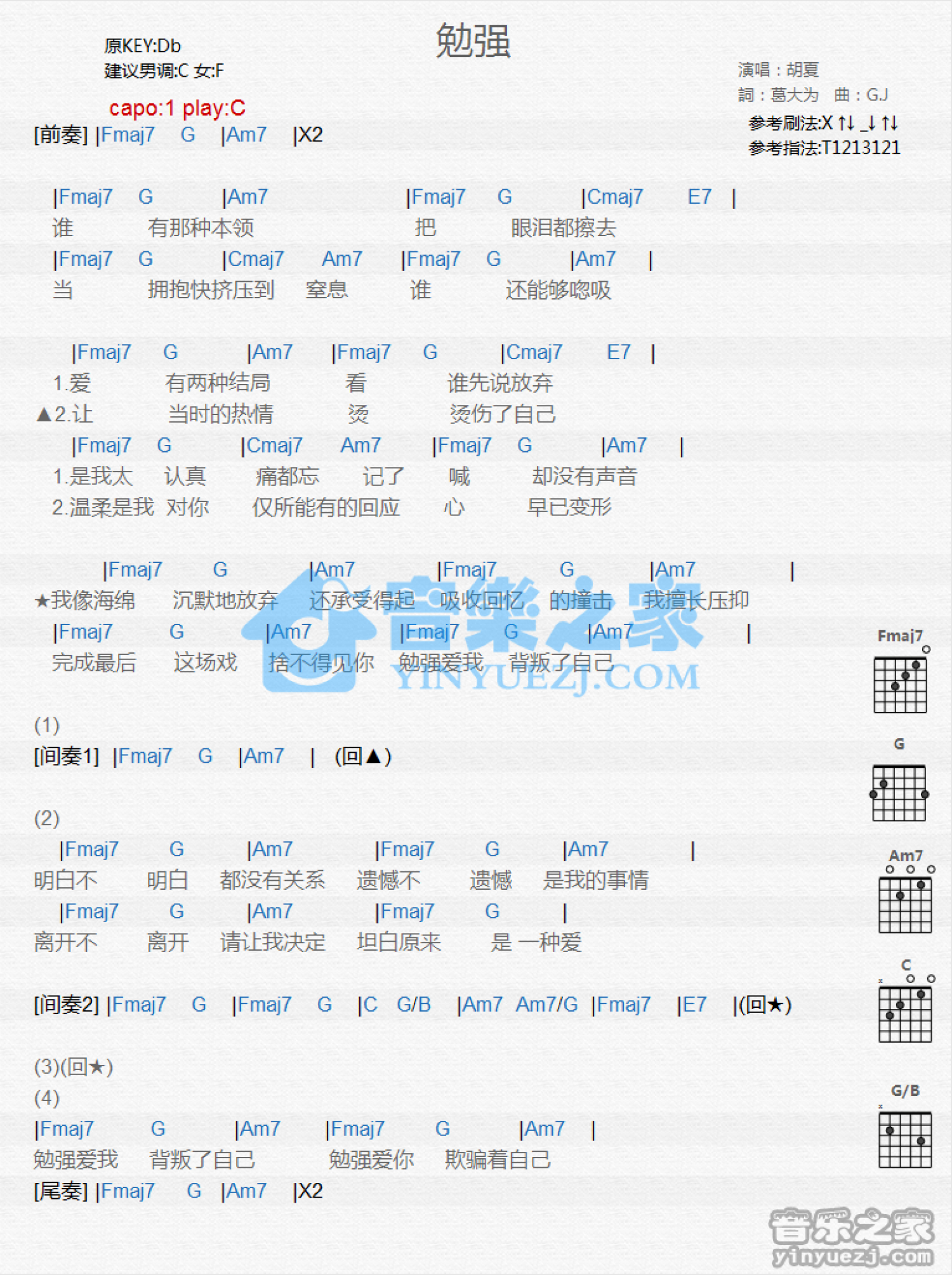 曲谱介绍: C调版《勉强》吉他和弦弹唱谱