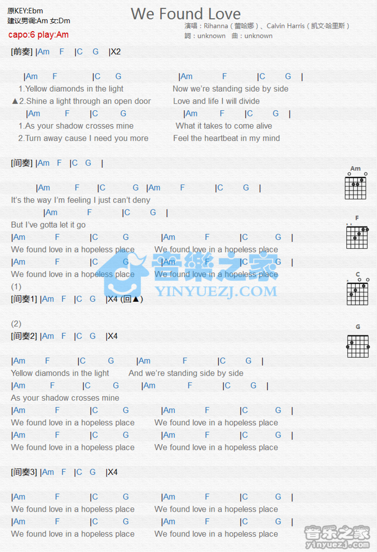 曲谱介绍: Am调版《WeFoundLove》吉他和弦弹唱谱