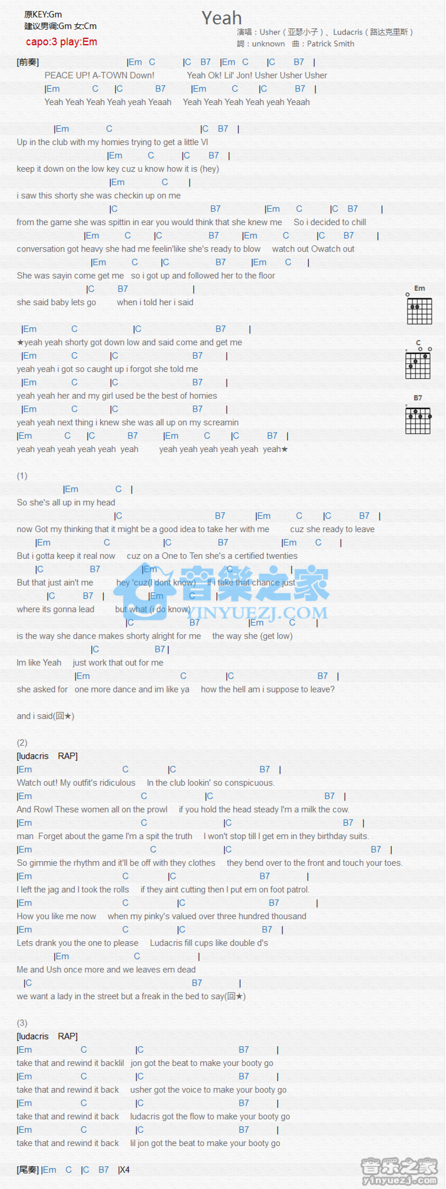 曲谱介绍: Em调版《Yeah》吉他和弦弹唱谱