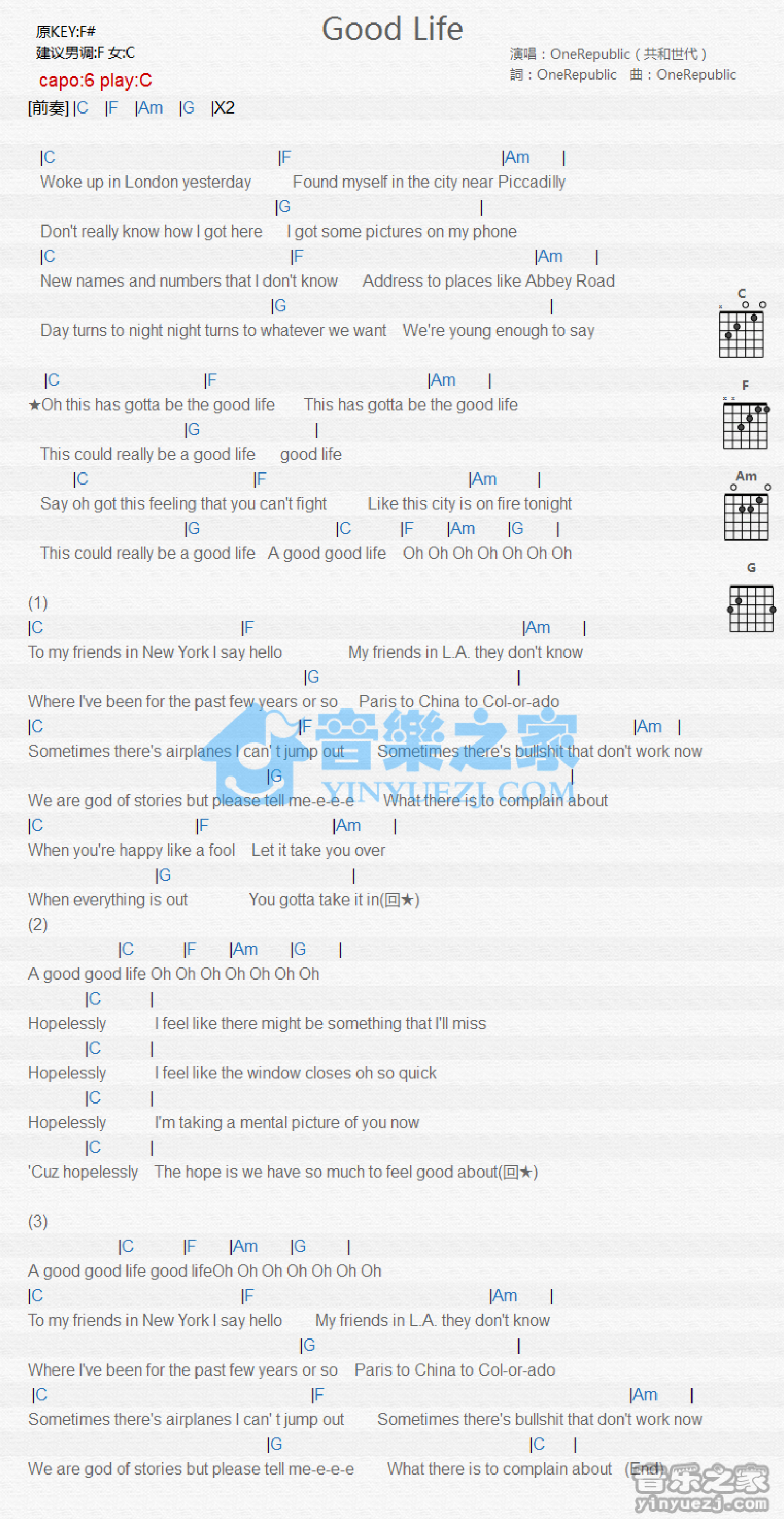 Good Life吉他谱 - OneRepublic - C调吉他弹唱谱 - 和弦谱