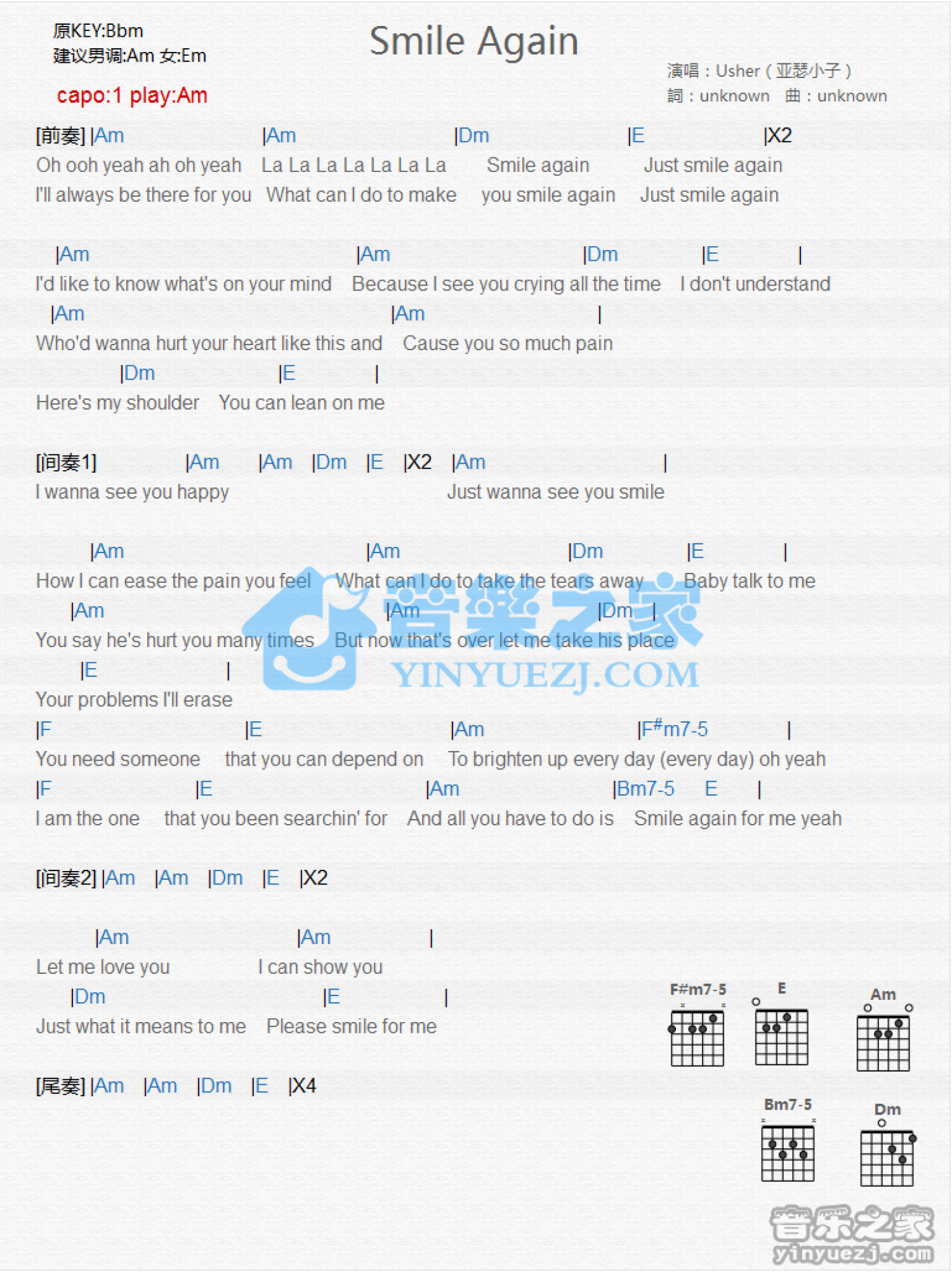曲谱介绍: Am调版《SmileAgain》吉他和弦弹唱谱