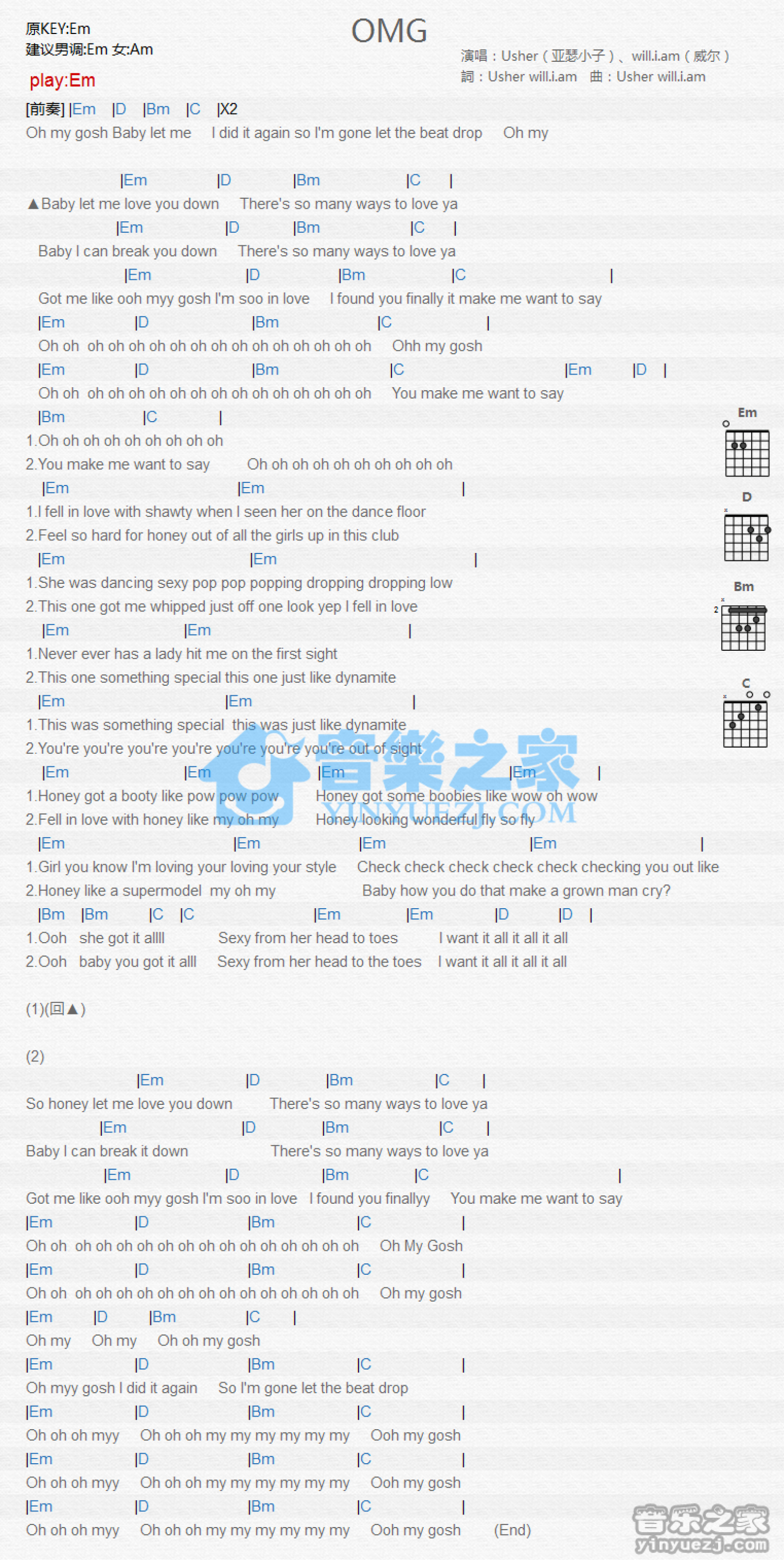曲谱介绍: Em调版《OMG》吉他和弦弹唱谱
